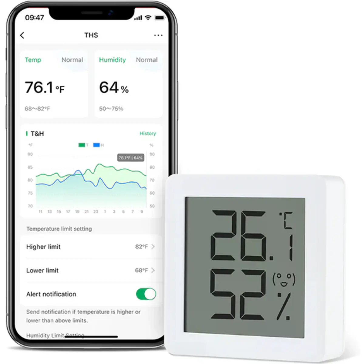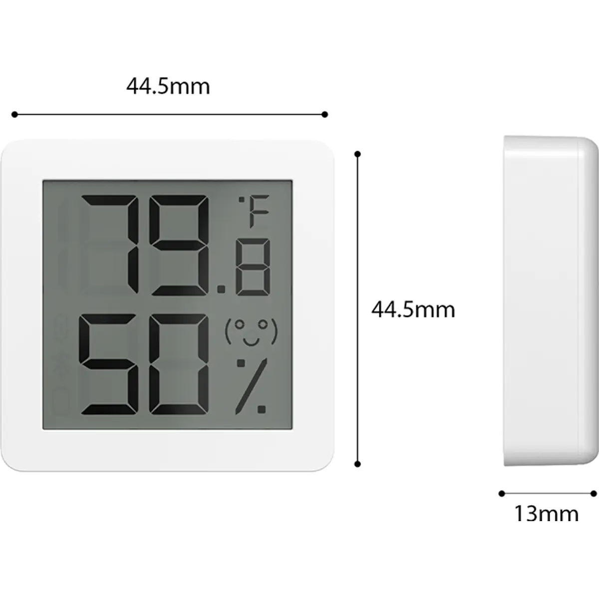 Mini higrômetro inteligente sem fios com Bluetooth 5.0 que mede temperatura (-9,9 a 60 °C) e humidade (0 a 99% RH). Possui ecrã LCD para leitura direta e gráfico de 24h com histórico até 3 anos. Notifica o telemóvel quando limites são ultrapassados e pode ser controlado por voz através de assistentes de voz. Compatível com iOS 11.0+ e Android 5.1+, dimensões 44,5 x 44,5 x 13 mm, pilha CR2032 com autonomia de 1 ano. Requer emparelhamento com módulo externo; suporta até 10 sensores BLE; ideal para monitorização em zonas.