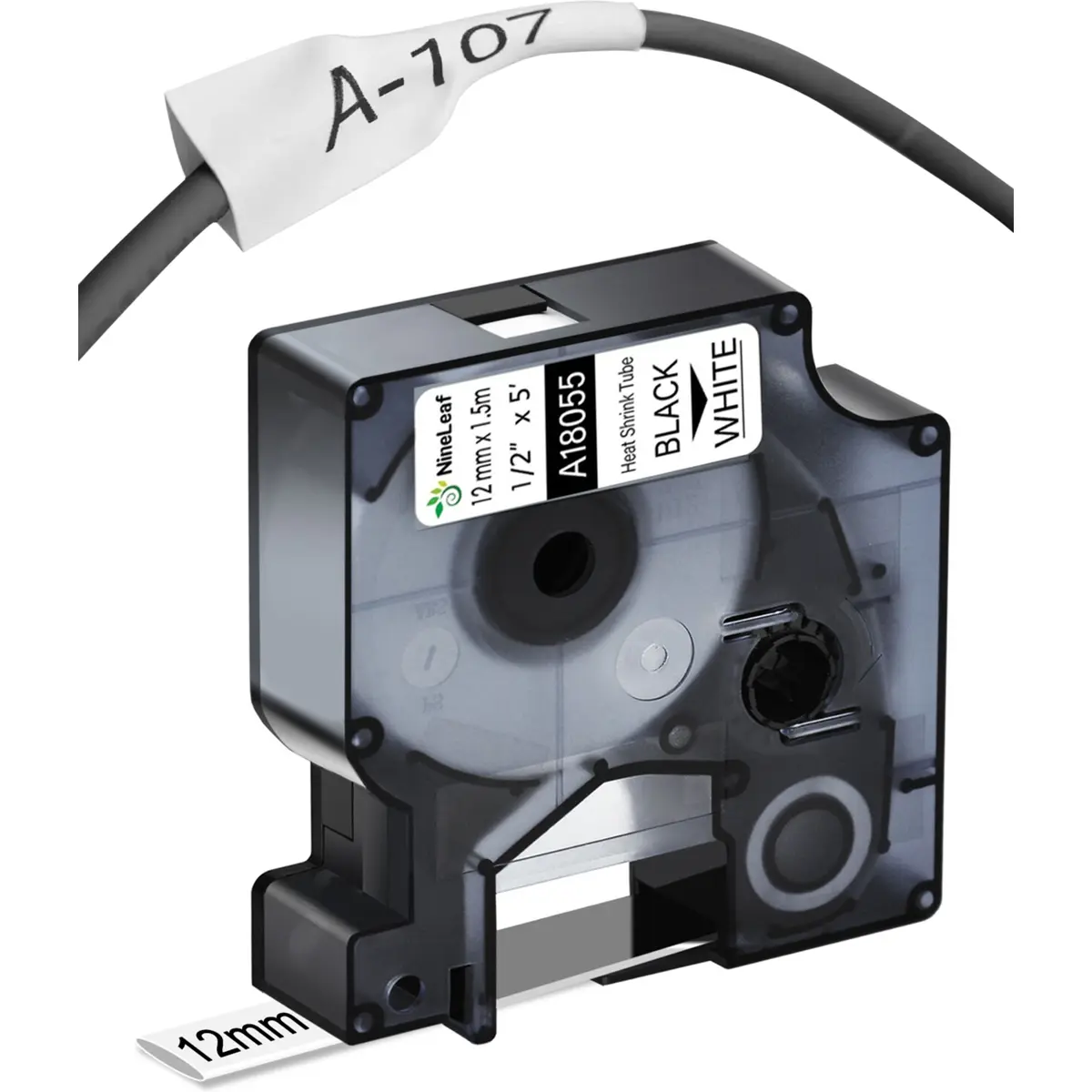 DYMO S0718300 - Tubo termoretrátil 3:1 RHINO 18055 p/ cabos 2.9..5.1mm [Preto sobre Branco] 12mm x 1.5m