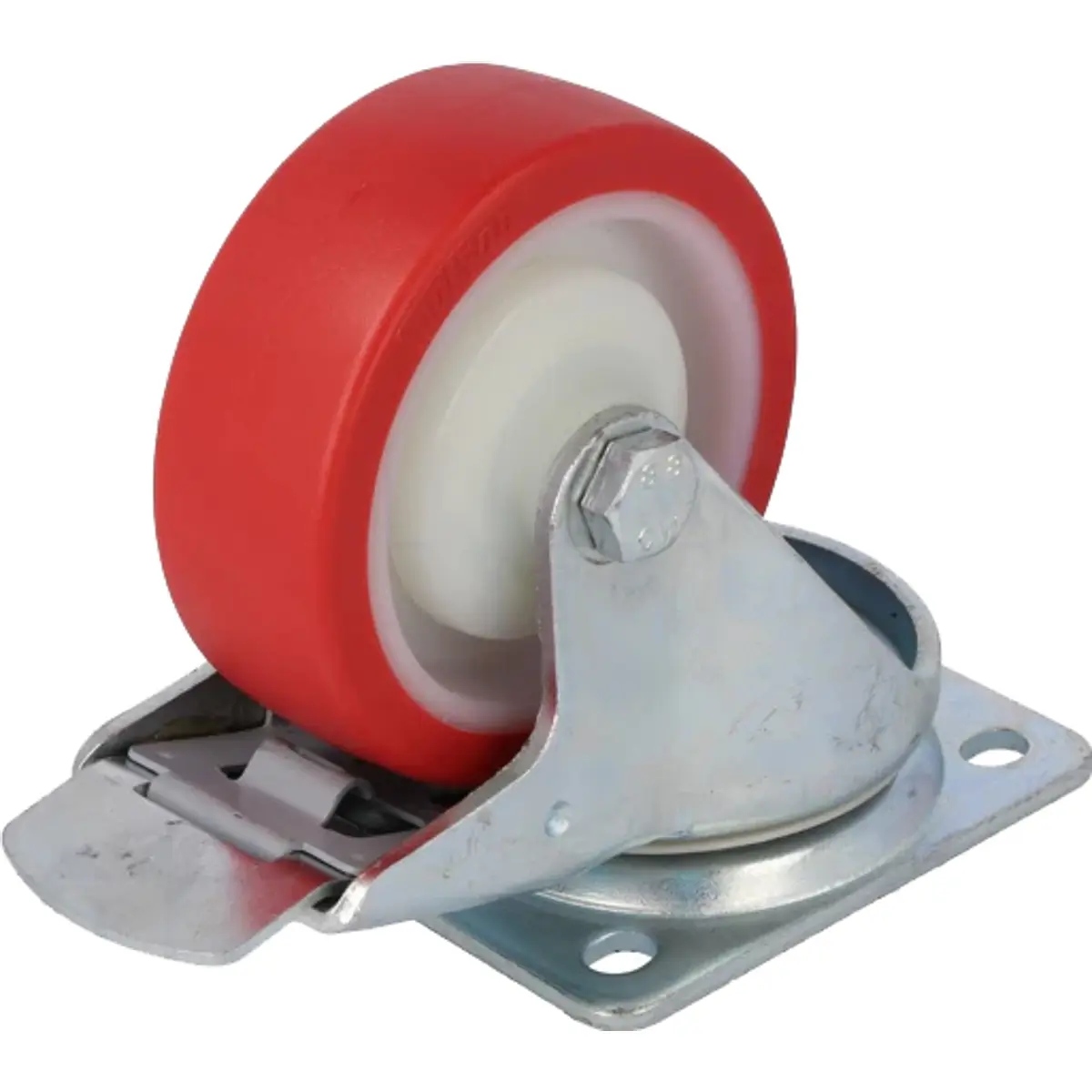 Roda de transporte com capacidade de carga de 250 kg, altura de 128 mm, base de 105 x 88 mm e diâmetro da roda de 100 mm. Possui rolamento esférico, largura de 30 mm e está disponível numa versão com placa de montagem, incluindo opção de tração com bloqueio.