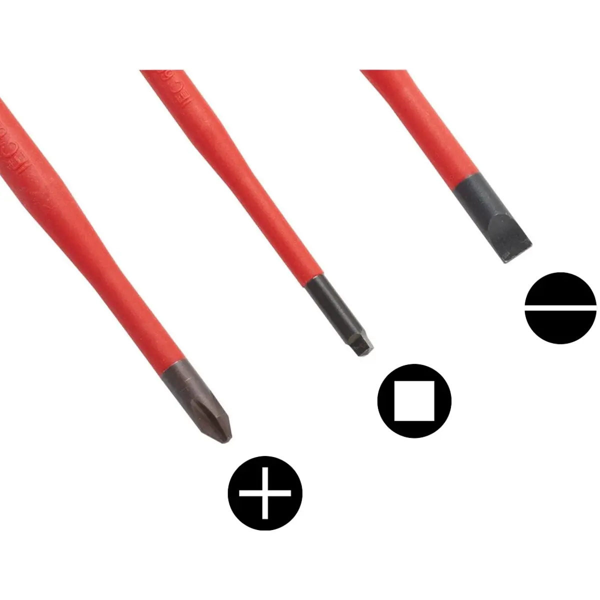Foram projetadas para agarrar corretamente o parafuso, aplicando o máximo de torque sem danificar a cabeça e cada chave de fendas é testada individualmente até 10000 volts.