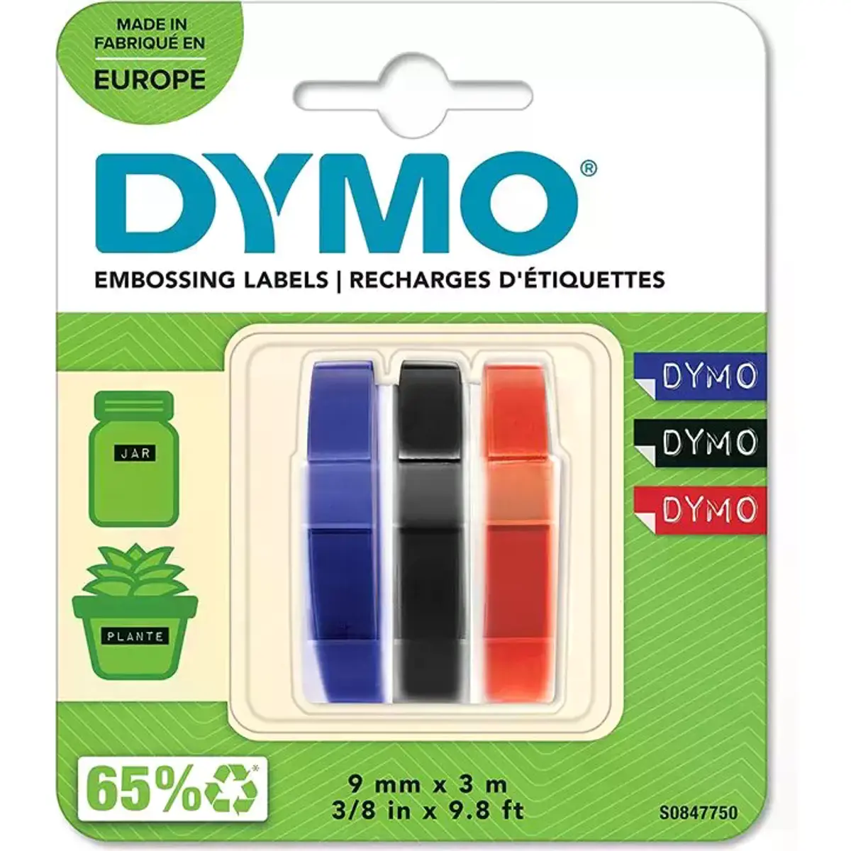 DYMO S0847750 - Conjunto de 3 Fitas autocolante para rotuladoras de relevo [9mm x 3m] - AZL/PRT/VRM