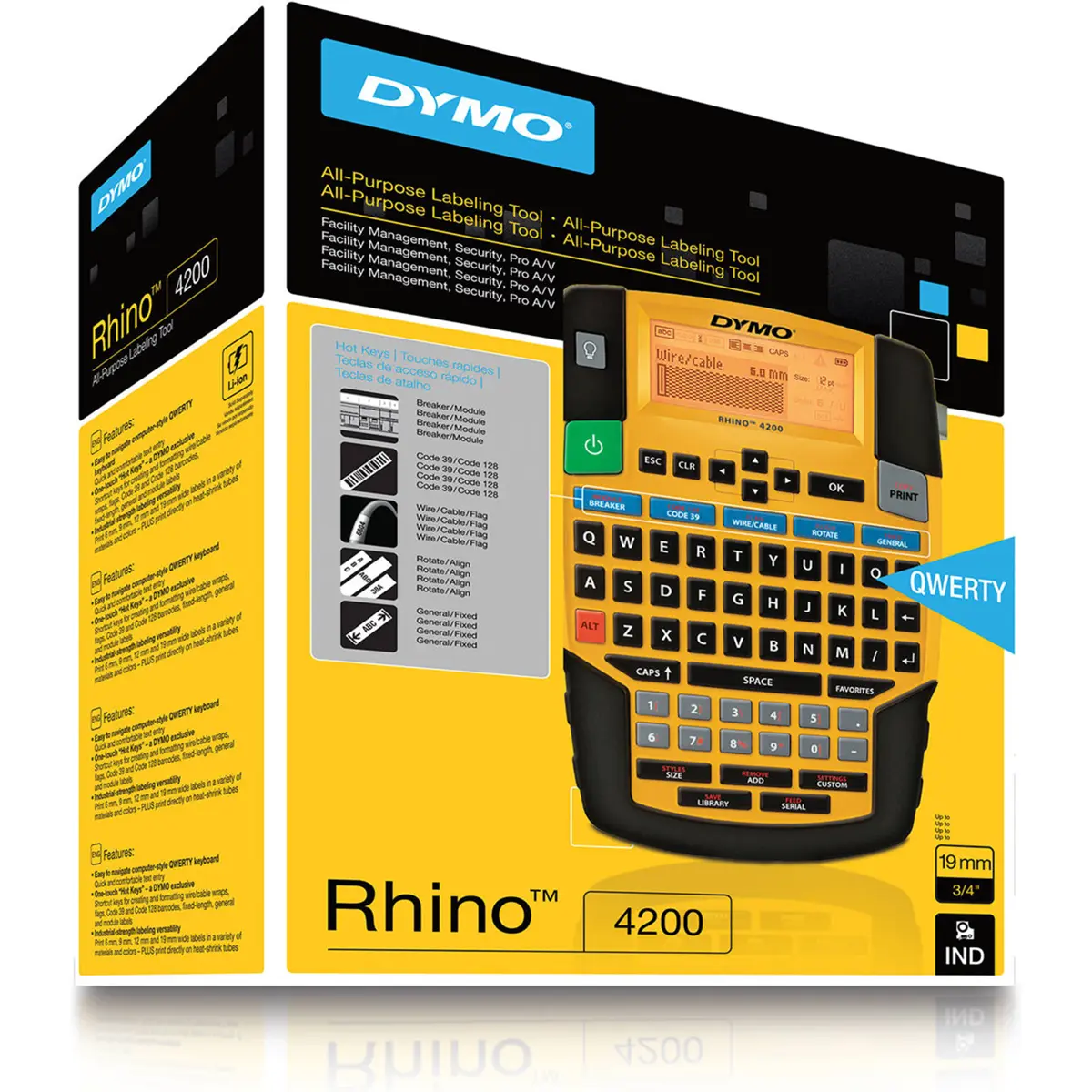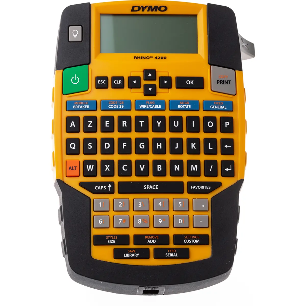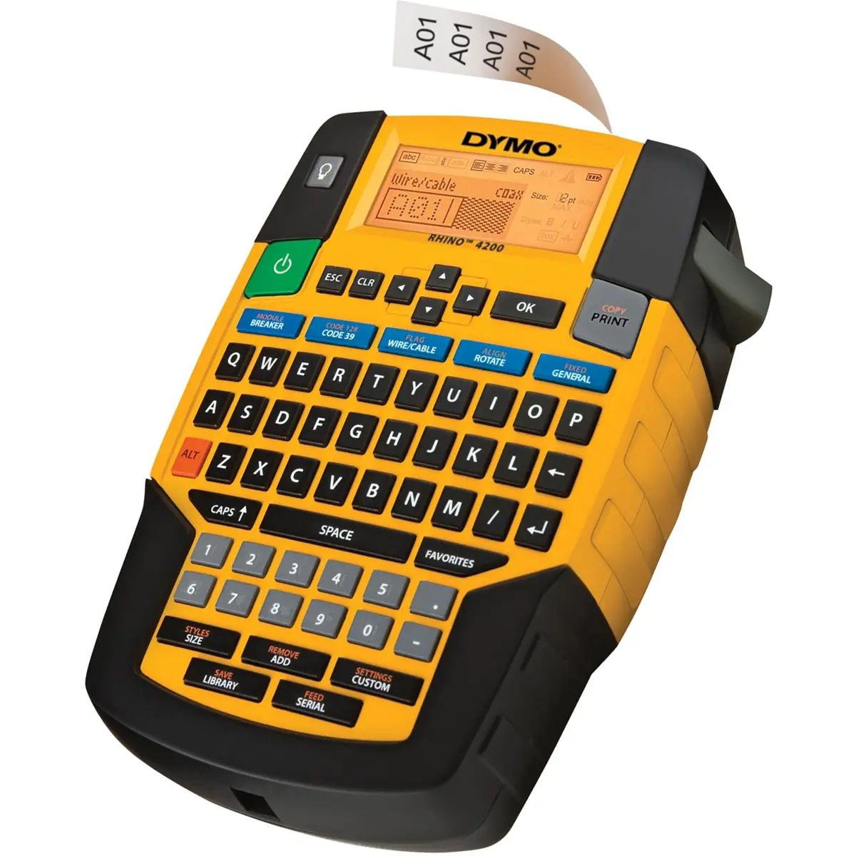 Com o seu teclado QWERTY familiar e uma biblioteca com mais de 150 símbolos e termos dedicados a instalações elétricas, AV profissional, segurança e gestão de instalações, o Rhino 4200 é a solução ideal para trabalhos de etiquetagem industrial, garantindo rapidez e precisão. As teclas de atalho "Hot Keys" permitem criar e formatar etiquetas para fios/cabos, bandeirolas e etiquetas de comprimento fixo de forma ágil, enquanto a tecla "Favoritos" oferece acesso imediato aos símbolos e termos mais utilizados. O Rhino 4200 pode imprimir etiquetas até 19 mm (3/4") de largura em materiais resistentes como nylon flexível, poliéster permanente e vinil durável, além de suportar impressão direta em tubos termo-retráteis. Para maior proteção no local de trabalho, dispõe de para-choques de borracha integrados para evitar danos causados por quedas e impactos.