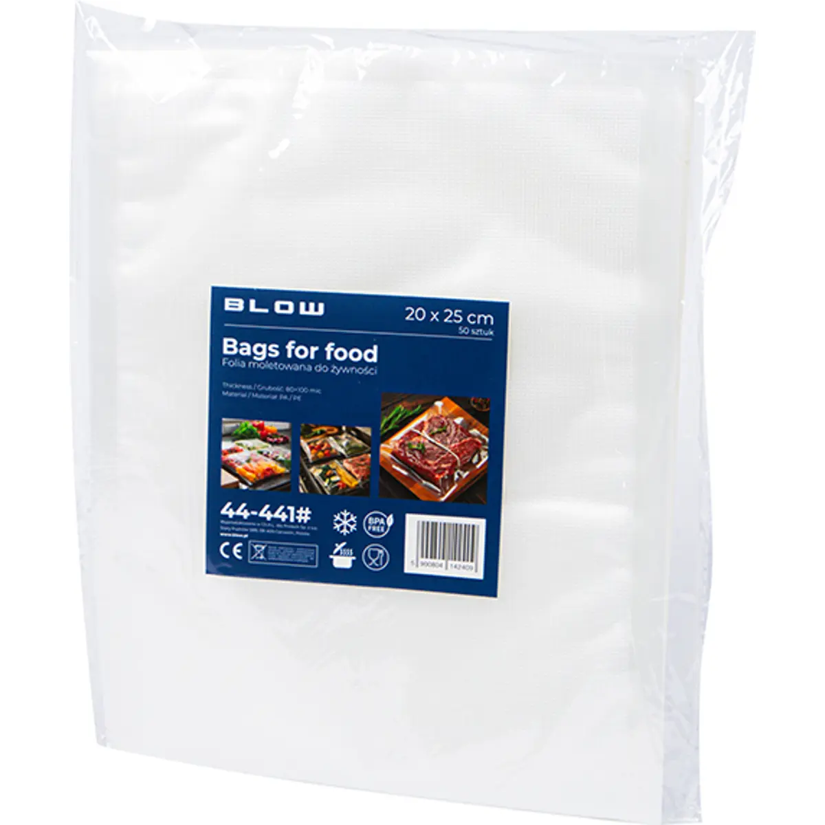 Conjunto de 50 sacos de plástico PA/PE sem BPA para embalagem em vácuo, com 20x25 cm, 80+100 μm de espessura. Altamente transparentes e com elevada resistência mecânica, são compatíveis com seladoras a vácuo domésticas e ideais para preservar humidade, sabor e nutrientes de peixe, carne, especiarias e nozes, reduzindo desperdícios e otimizando o espaço de armazenamento. Certificados CE.
