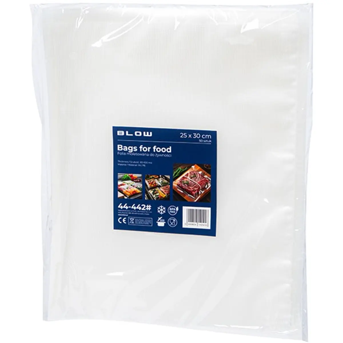 Conjunto de sacos para máquina de vácuo, fabricados em PA/PE sem BPA, com dimensões de 25x30 cm, espessura total de 80+100 μm e 50 unidades por embalagem. Altamente transparentes e com maior resistência mecânica, são compatíveis com seladoras a vácuo modernas. Ideais para armazenar peixe, carne fresca, carnes frias, especiarias, nozes e outros produtos, mantendo a humidade, o sabor e o valor nutricional. Adequados para uso industrial e doméstico, favorecem o aproveitamento de espaço e reduzem desperdícios.