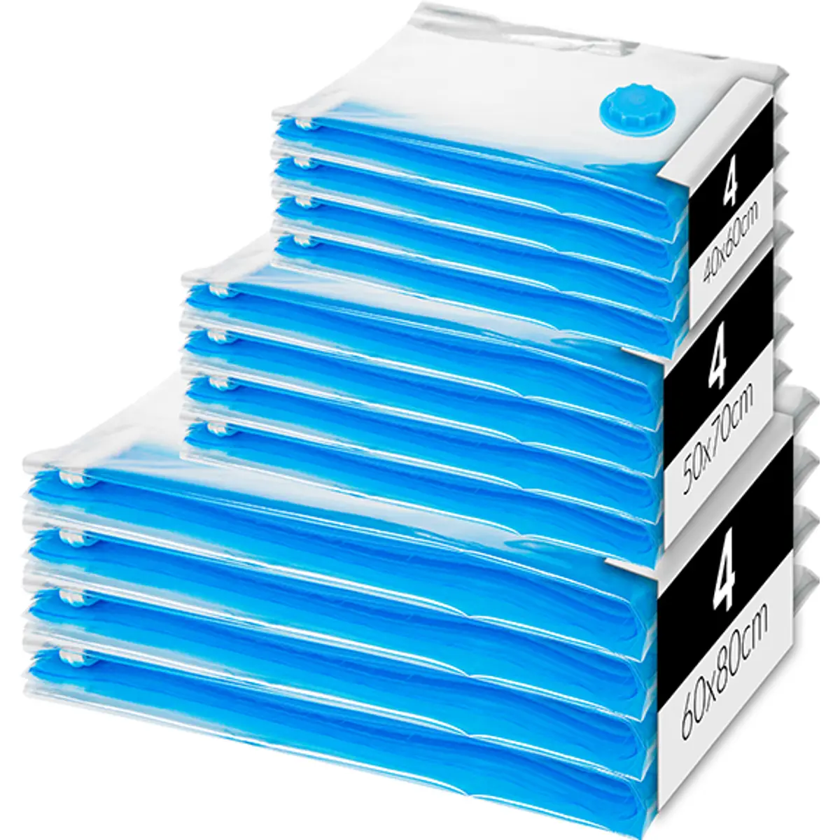 Conjunto de 12 sacos de arrumação a vácuo para têxteis, roupas, roupa de cama, toalhas e cobertores, ideal para viagens e espaços reduzidos. Reduzem o volume em até 75% e protegem contra humidade, poeira, sujeidade e odores, mantendo os itens em condições ideais. É fácil de usar: basta colocar a peça, fechar a bolsa e aspirar o ar com uma bomba de aspiração ou aspirador de pó. Reutilizáveis, com nylon e polietileno, disponíveis em 3 tamanhos: 40x60 cm, 50x70 cm e 60x80 cm.
