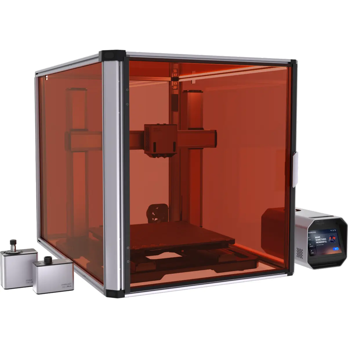 Impressora 3-em-1 modular com extrusão dupla, corte e gravação a laser de 10W e fresagem CNC de 200W. Oferece área de trabalho de 400x400x400 mm, tampas resistentes e design em metal para estabilidade. Inclui guias lineares de alta precisão, sistema de mudança rápida de ferramentas e controlo via ecrã tátil de 7 polegadas. O software Luban gratuito facilita a configuração de impressão, gravação a laser e fresagem, com compatibilidade com Windows, macOS e Linux e opções de transmissão por Wi-Fi ou USB.