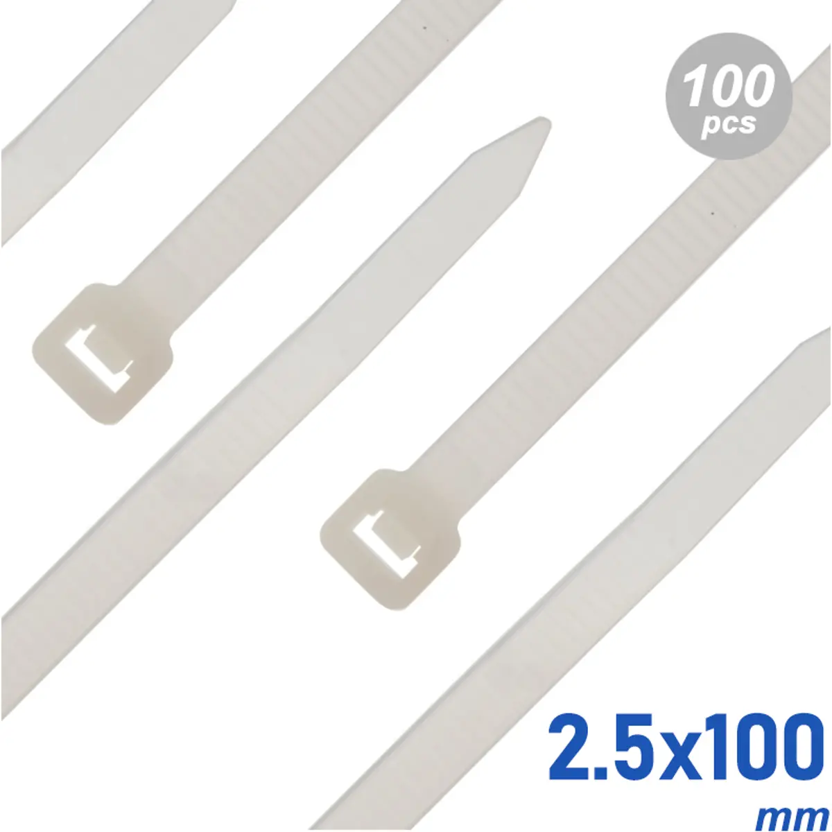 Abraçadeiras de fivela brancas, em nylon (Poliamida 6.6), com 2,5 mm de largura e 100 mm de comprimento, ideais para fixação fiável de cabos e conduítes. Diâmetro máximo 20,5 mm e mínimo 3 mm; resistência 79 N; embalagem de 100 peças. Absorção de humidade 2,5 %, temperatura operativa de -40 ºC a +85 ºC (instalação -20 ºC a +85 ºC) e temperatura máxima permissível de +110 ºC a curto prazo. Fusão a +260 ºC, LOI 27 %, inflamabilidade UL94 classe V2; resistência dielétrica de 50.000 V/mm. Resina sem halógenos: Sim; radiação UV: Não.
