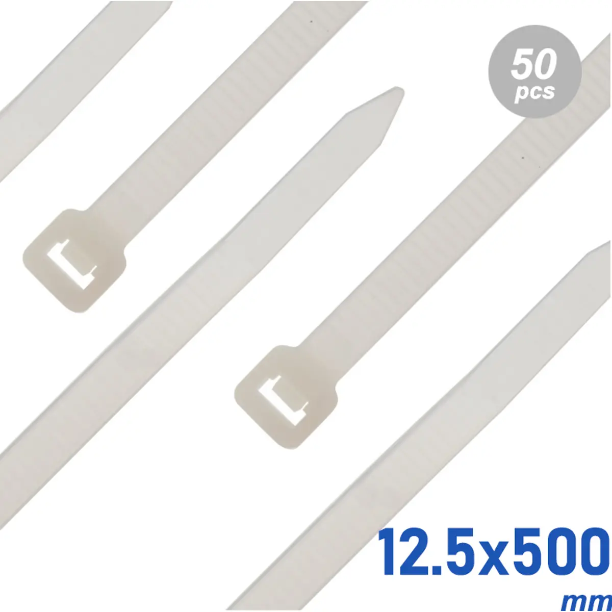 Abraçadeiras de fivela em nylon de alta resistência, largura 12,5 mm e comprimento 500 mm, cor branca, adequadas a diâmetros de até 156 mm e mínimos de 8,5 mm. Possuem resistência dieléctrica de 50.000 V/mm, operam entre -40 °C e +85 °C, e suportam instalação a -20 °C a +85 °C. Embaladas em packs de 50 unidades, com resina sem halogéneos.
