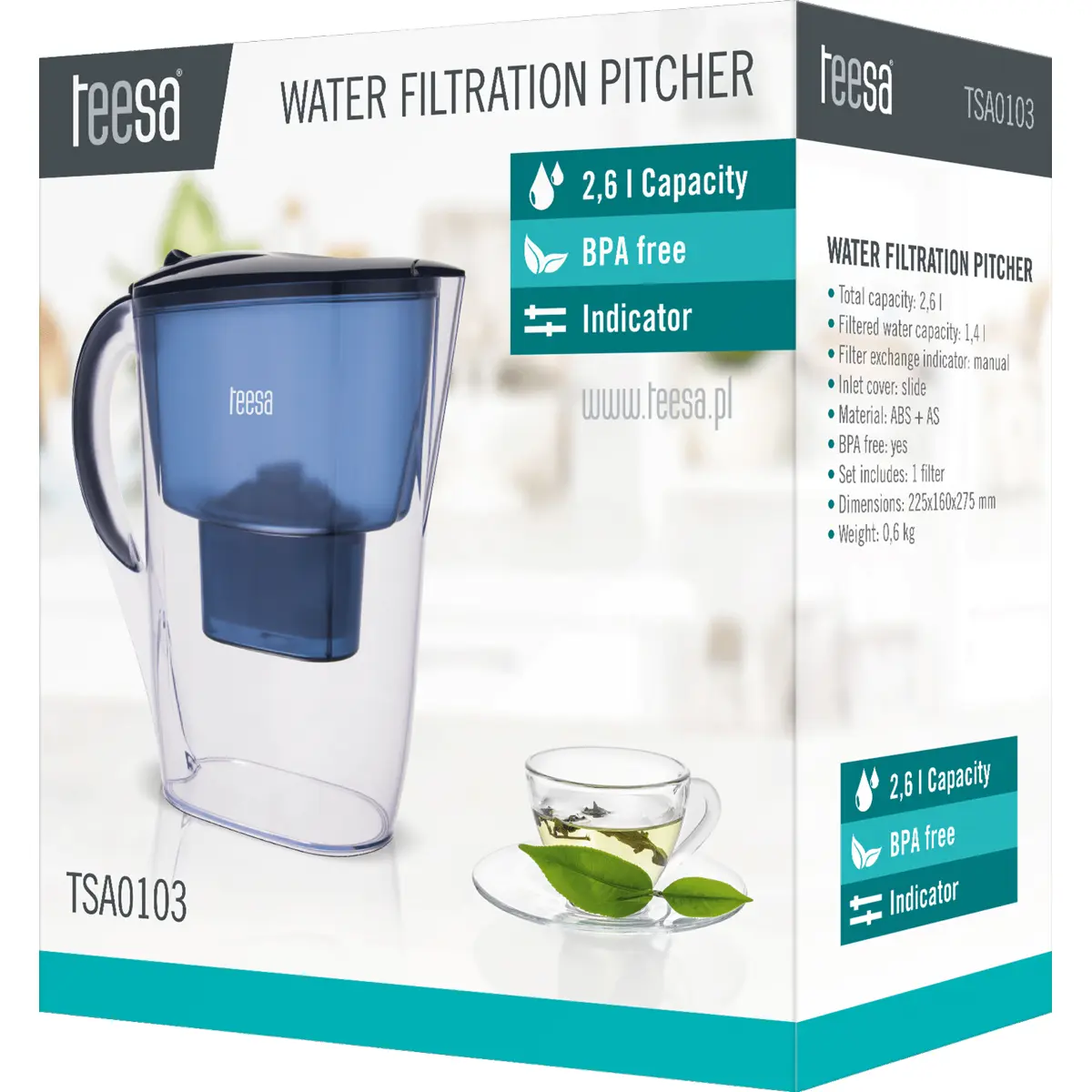 Ao adquirir o jarro filtrante Teesa, ganha uma solução prática e econômica para o consumo de água diário. Com seu sistema de filtragem avançado, ele elimina o cloro, calcário e outras substâncias indesejadas da água da torneira, tornando-a segura e agradável para beber. Assim, evita a necessidade de comprar garrafas pesadas e dispendiosas, reduzindo também o impacto ambiental.