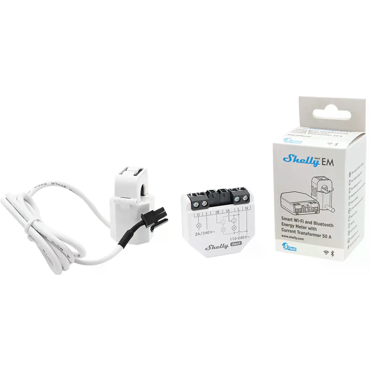 ◾ * O Shelly EM Gen3 vem com apenas um núcleo (Transformador de intensidade - TI) de 50A, incluído na embalagem.