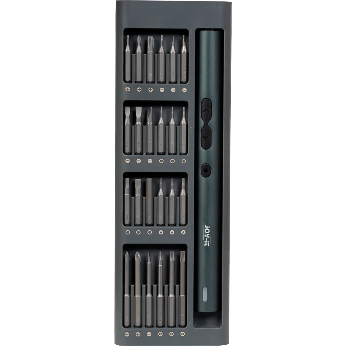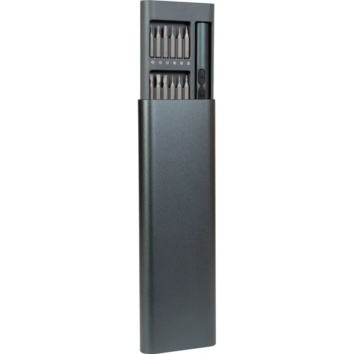 As pontas são armazenadas magneticamente no suporte plástico, que se encaixa na robusta estrutura em alumínio e é mantido no lugar por um mecanismo de clique, garantindo organização e acessibilidade.