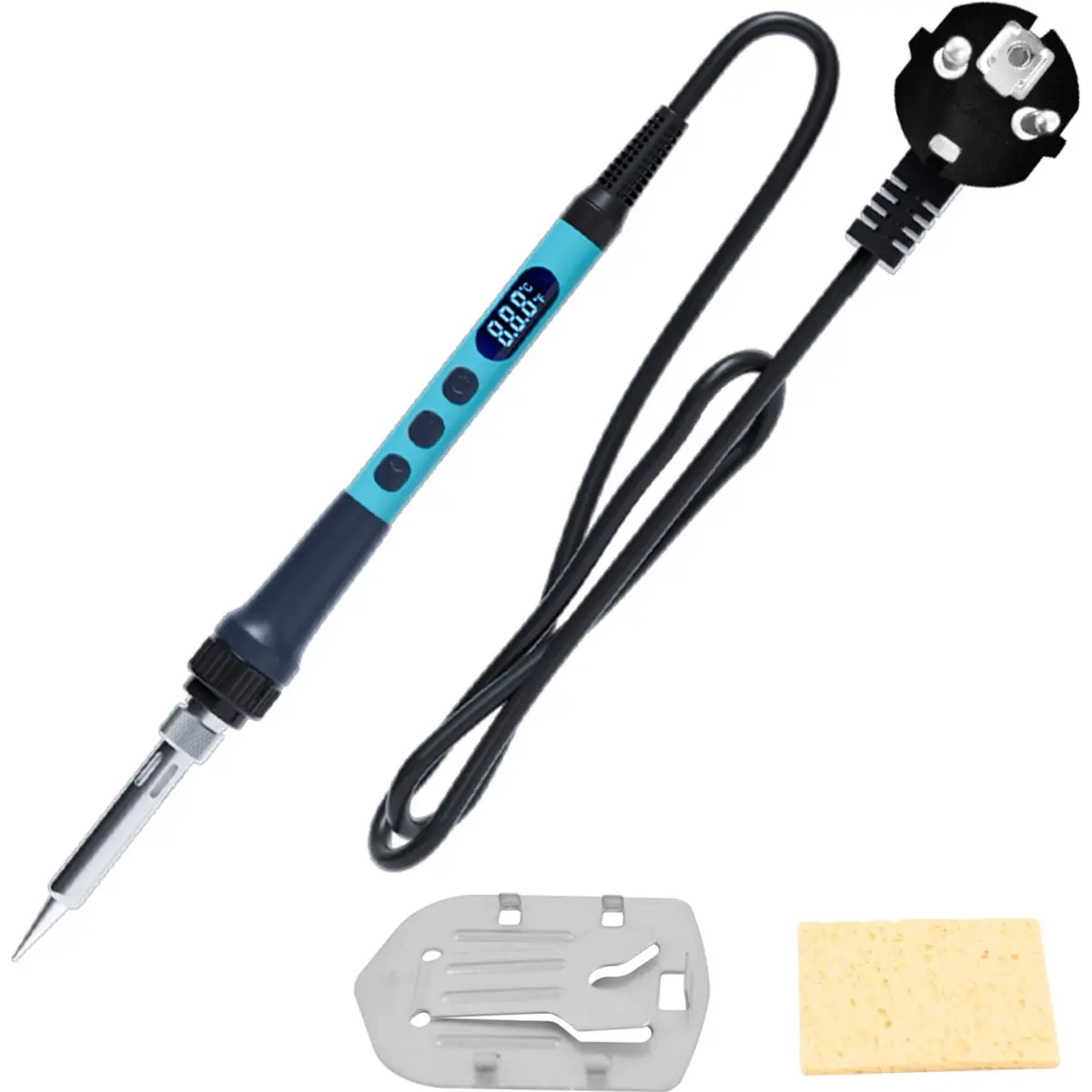 - Acessórios incluídos: suporte metálico para ferro de soldar, esponja de limpeza e ponta de solda 900M-T-I.