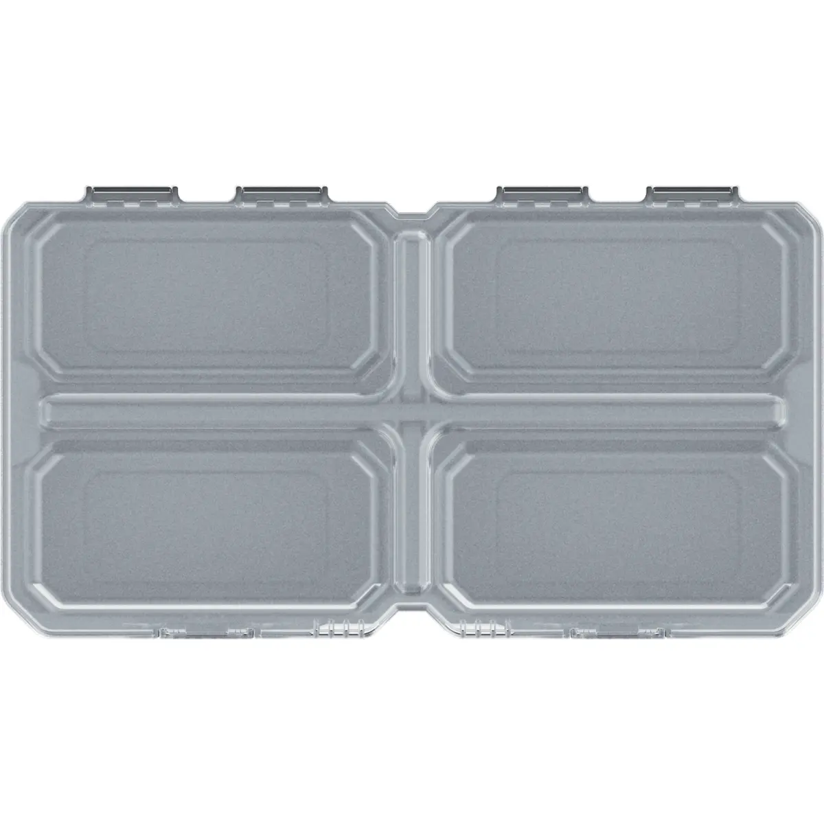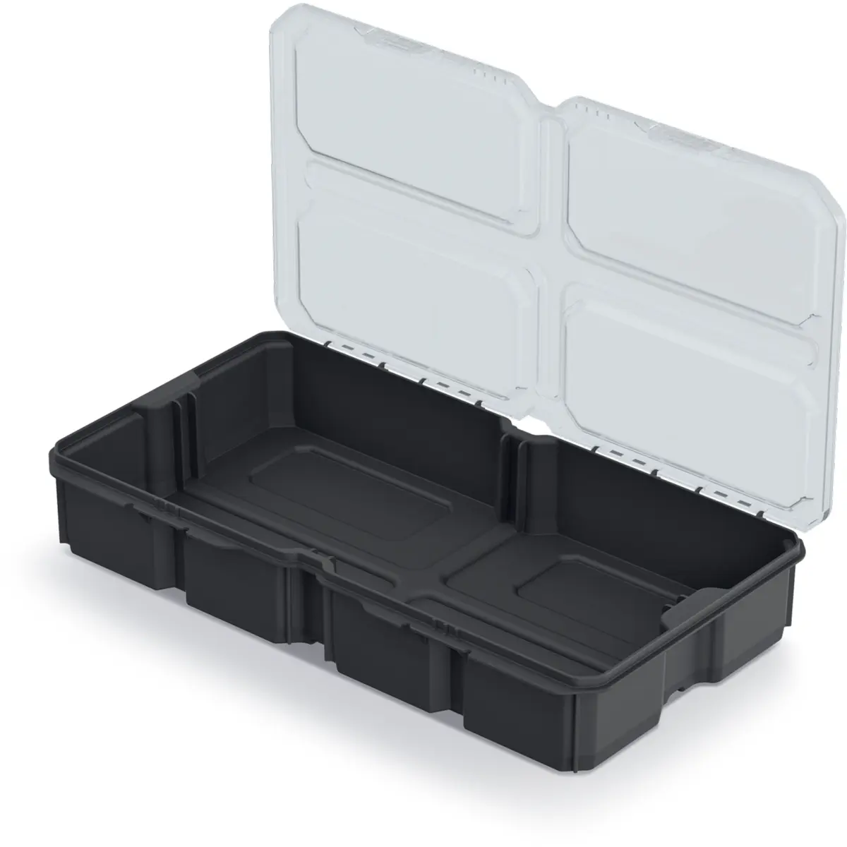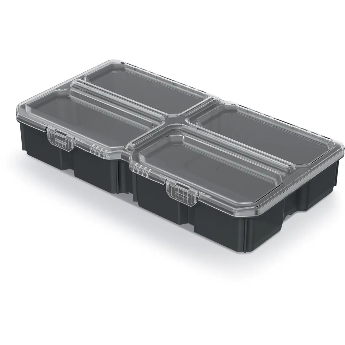 Caixa organizadora transparente com quatro compartimentos, fabricada em plástico de alta resistência. A mistura de polímeros confere robustez e resistência ao impacto, ideal para armazenar ferramentas e acessórios. Possui tampa translúcida com estrutura preta, e grau de proteção IP55 que protege contra poeira e salpicos. Leve, com peso de apenas 0,208 kg, é prática para oficinas, ateliers e espaços de trabalho domésticos.