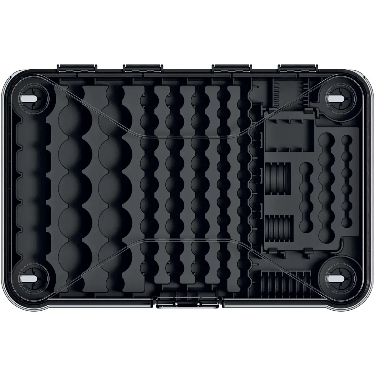 Caixa organizadora de pilhas com 115 compartimentos e tampa transparente que permite localizar rapidamente as pilhas sem abrir o organizador. O corpo é construído com uma mistura de polímeros de alta resistência, oferecendo boa resistência ao impacto. Pode ser montada na parede graças aos orifícios de montagem. A combinação de tampa transparente e corpo preto facilita a identificação de itens. Mede 295 x 195 x 70 mm, pesa cerca de 0,478 kg, e é ideal para manter pilhas organizadas, acessíveis e seguras.