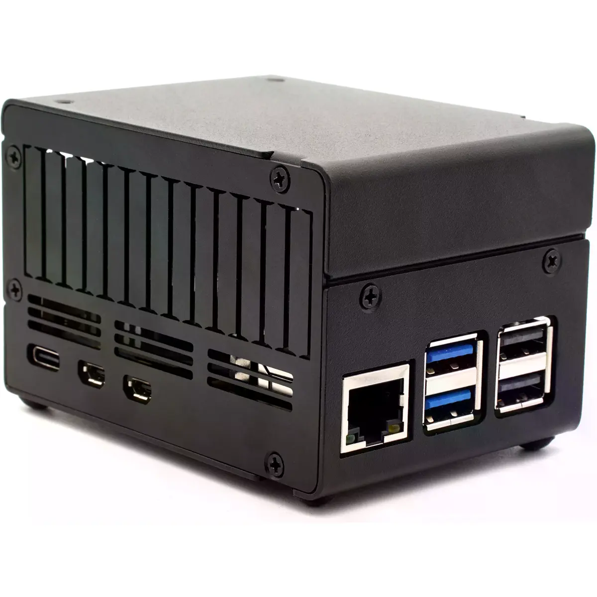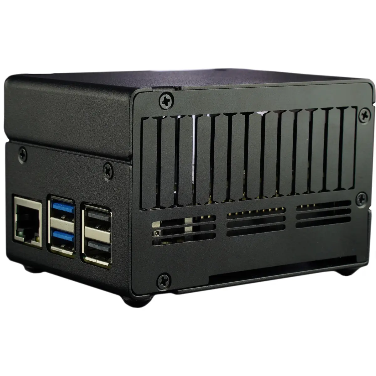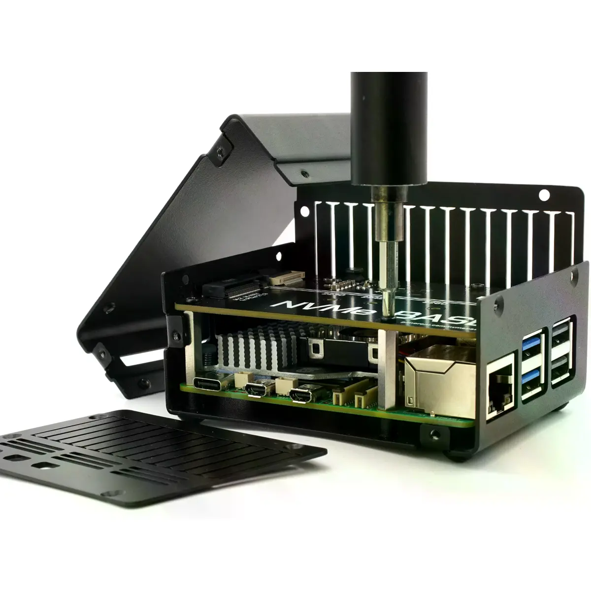 A caixa é projetada para suportar a maioria dos HATs, incluindo HATs NVMe, permitindo personalizações abrangentes para diversas aplicações como automação, multimédia ou projetos educacionais.