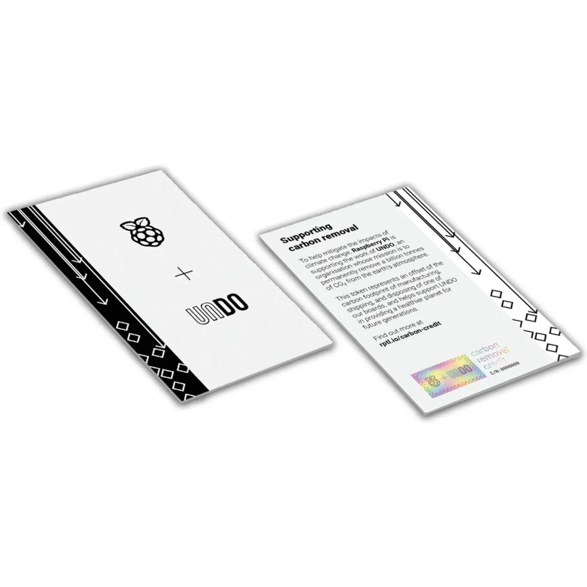 O Raspberry Pi Carbon Removal Credit é um cartão do tamanho de um cartão de crédito que serve como comprovativo da tua contribuição para a remoção de carbono. Cada cartão representa a compensação da pegada de carbono de uma placa Raspberry Pi e inclui um número de série único e verificável.