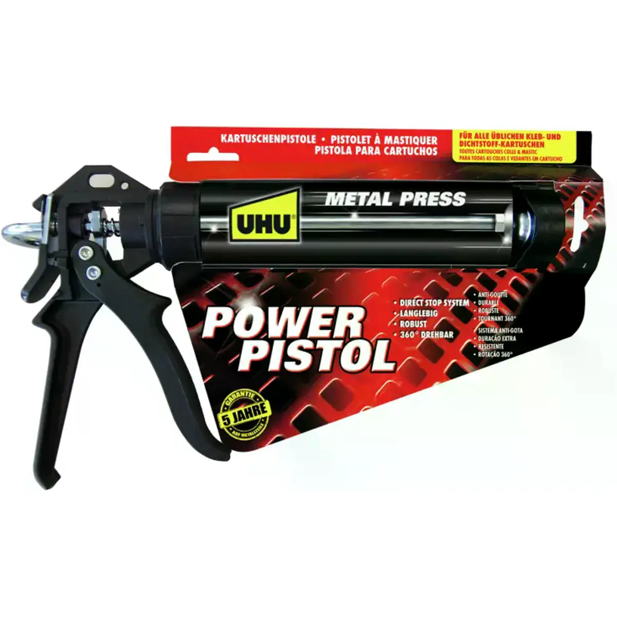 UHU Power Pistol: pistola para tubos de Cola/Silicone, robusta, ideal para todos os cartuchos comuns de cola e vedante. Desenvolvida para aplicações profissionais, é especialmente eficaz com vedantes de fácil manuseio e colas de alta resistência, oferecendo maior controlo e precisão durante o uso.