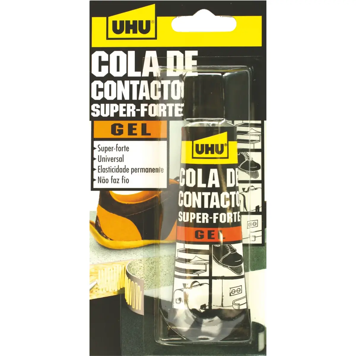 UHU Contact Gel 50 ml: adesivo de contacto universal super-forte em gel, fácil de espalhar, não escorre e não forma fios. Ideal para aplicações verticais e trabalhos que requerem colagem imediata com alta resistência.