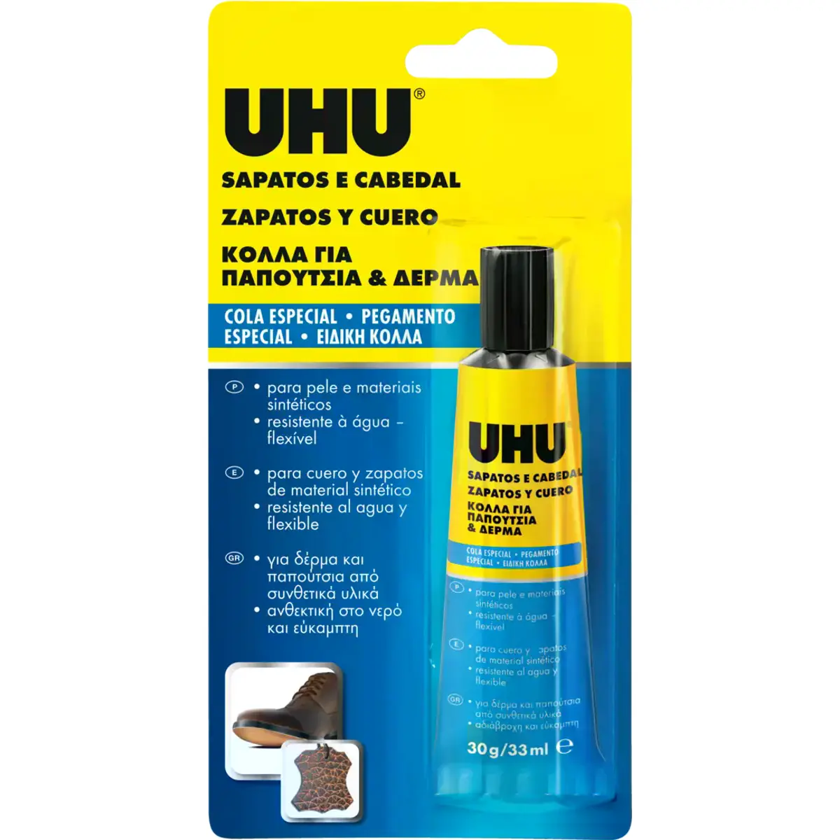 UHU SAPATOS E CABEDAL: cola de reparação rápida, ideal para colar cabedal e borracha, também em combinação com metal, tecido e materiais sintéticos. A colagem mantém-se flexível, equilibrando a tensão do material, com resistência elevada à água e à temperatura.