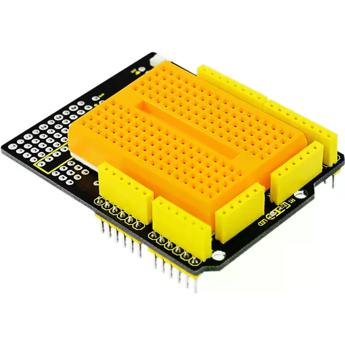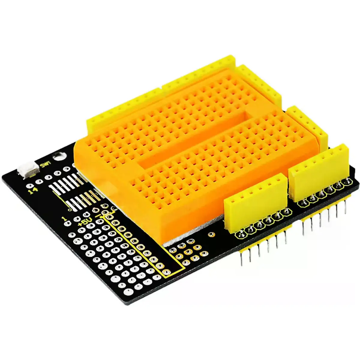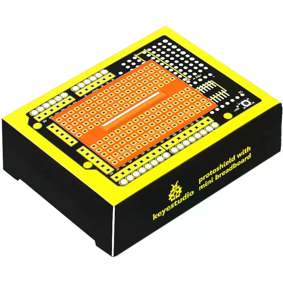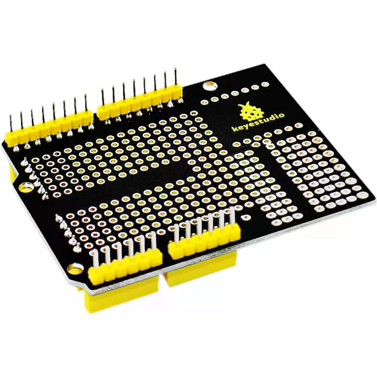 Keyestudio Proto Shield é especialmente projetado para a Arduino UNO R3. Facilita o design de circuitos personalizados e a soldagem de componentes eletrónicos diretamente na placa. Para um uso conveniente, há um amplo espaço de prototipagem com furos passantes conectados e não conectados no shield.