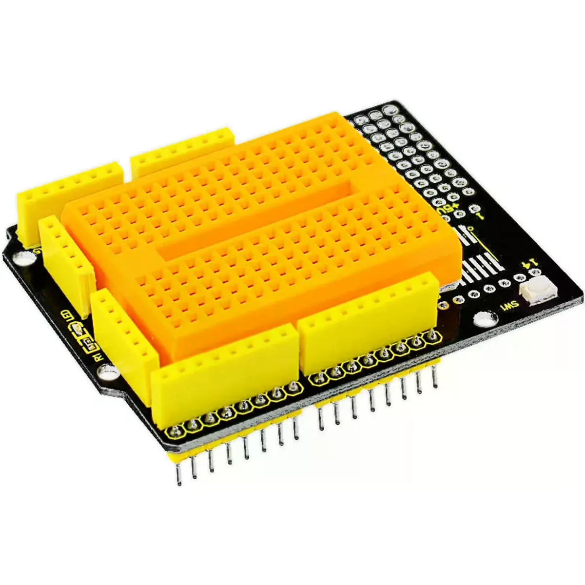 Pode até colar uma mini protoboard de 170 furos (inclusa) na área de prototipagem. Pode soldar os componentes diretamente no shield ou ligar os circuitos à mini protoboard.