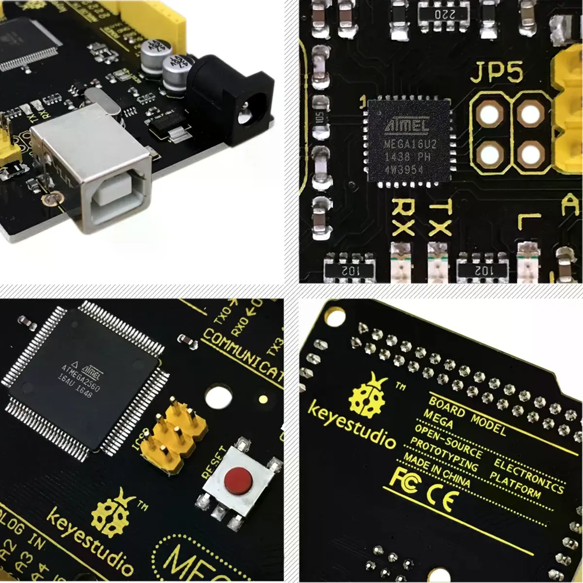 Keyestudio Mega 2560 R3 é uma placa de microcontrolador baseada no ATMEGA2560-16AU, totalmente compatível com ARDUINO MEGA 2560 REV3.