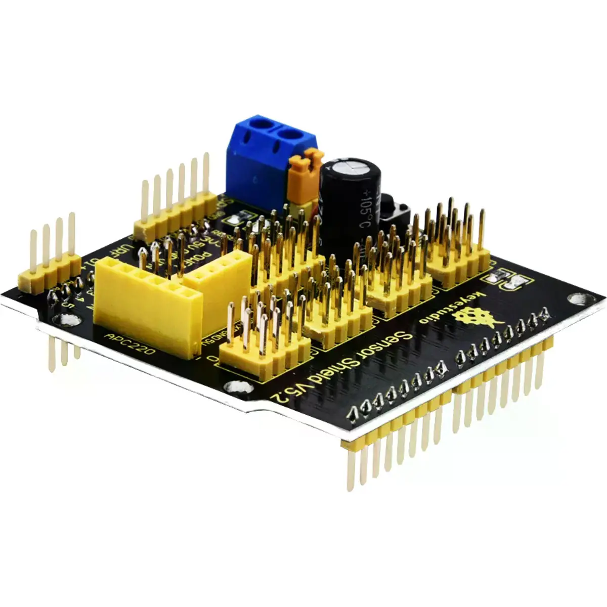 Além disso, pode fornecer a voltagem necessária aos módulos de sensores através dos blocos de terminais azuis no shield. Isso ocorre porque alguns módulos de sensores não utilizam 5V ou 3,3V, mas sim uma voltagem especial.