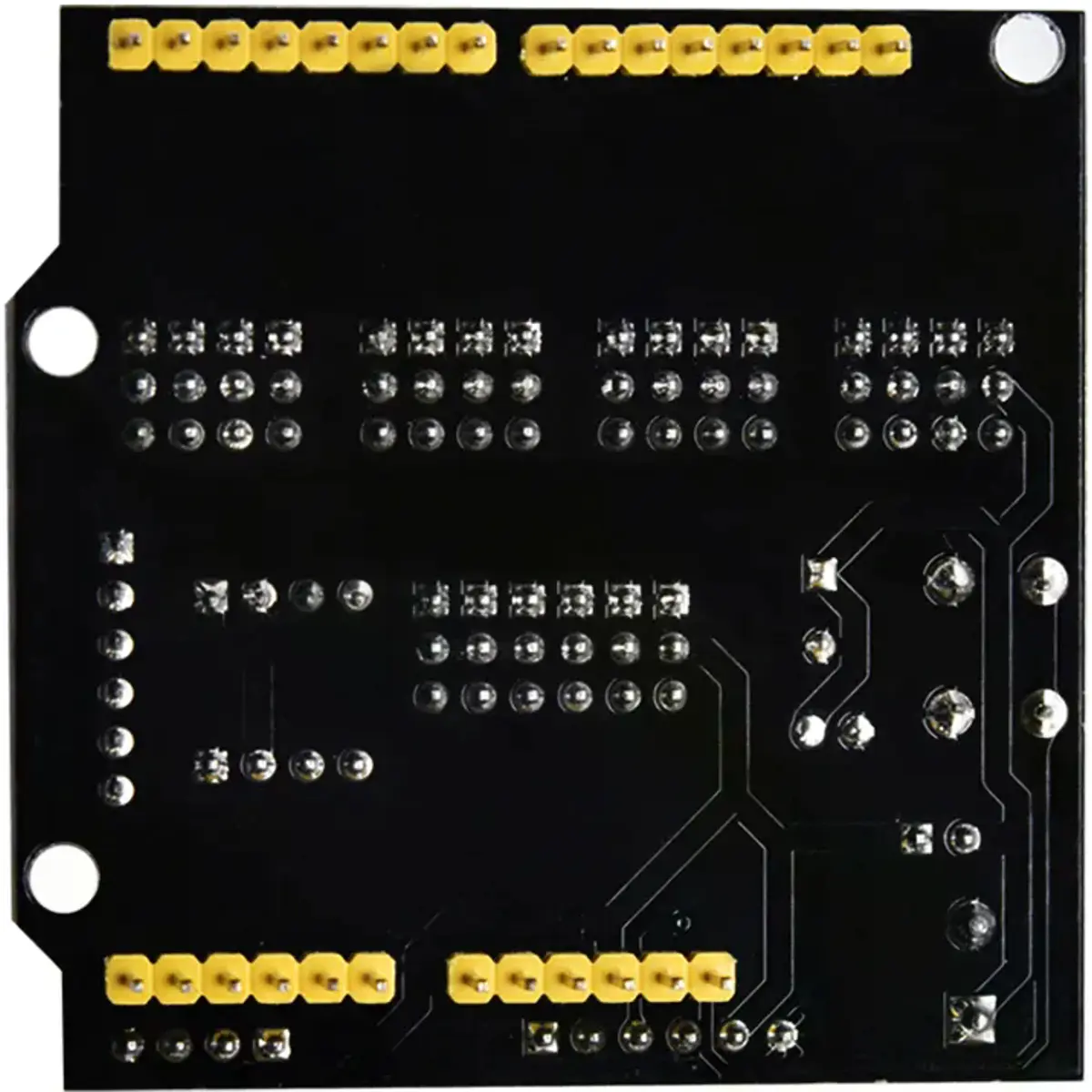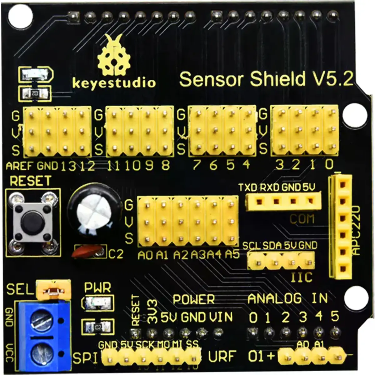- Expande todos os pinos digitais e analógicos do UNO R3 como conectores de 3 pinos