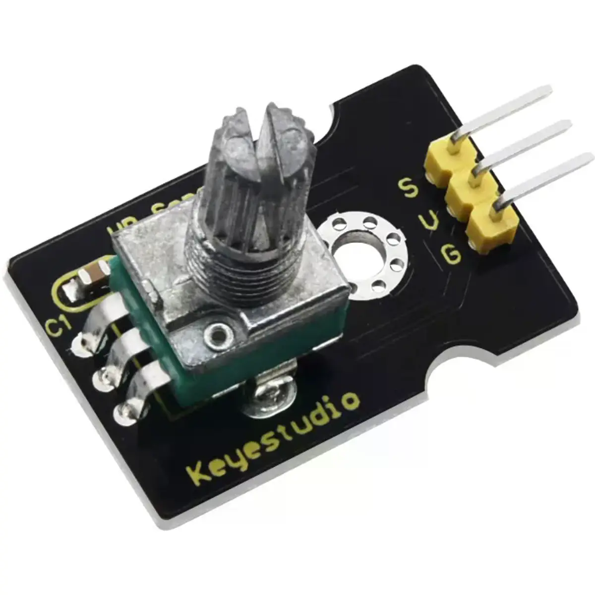 Este sensor de rotação analógico é totalmente compatível com o Arduino e baseado em um potenciômetro. A tensão de saída pode ser dividida em 1024 valores, facilitando a conexão com o Arduino através do nosso sensor shield. Combinado com outros sensores, é possível criar projetos interessantes ao ler o valor analógico a partir dos pinos de entrada/saída (IO).