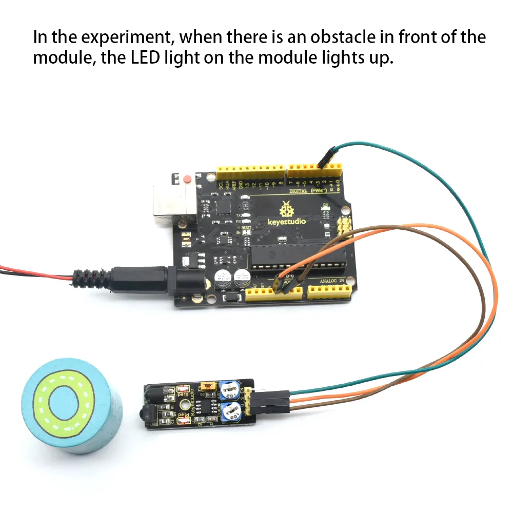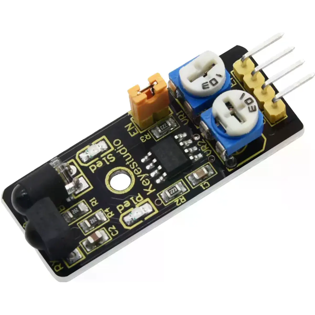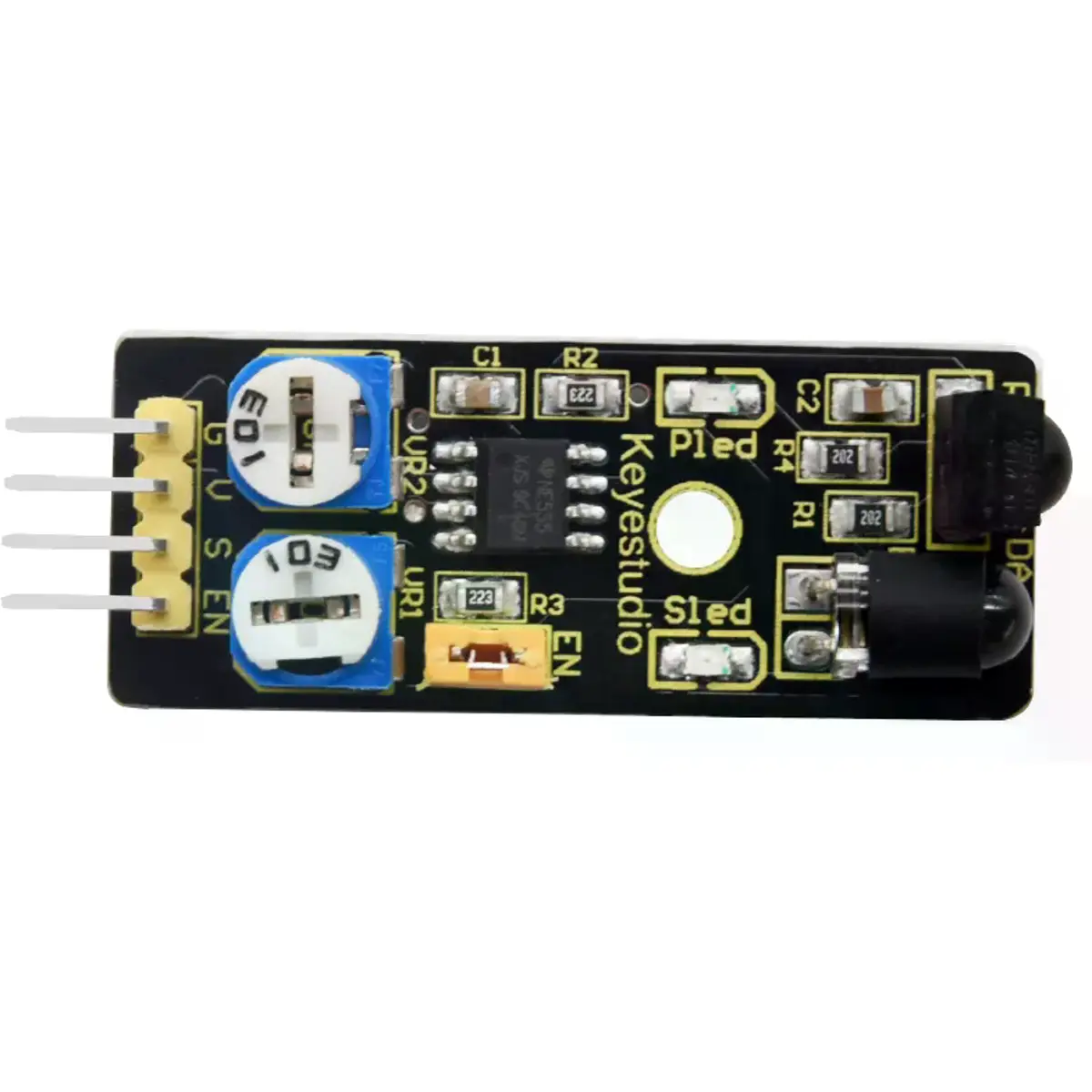 O sensor de evitação de obstáculos por infravermelho é equipado com a função de ajuste de distância e é especialmente projetado para robôs com rodas. Este sensor tem forte adaptabilidade à luz ambiente e alta precisão. Ele possui um par de tubos de transmissão e recepção infravermelha. Quando o raio infravermelho emitido pelo tubo transmissor encontra um obstáculo (ou refletor), o raio é refletido para o tubo receptor, e o indicador acende; a interface de saída de sinal fornece um sinal digital. Podemos ajustar a distância de detecção através do botão potenciômetro (distância eficaz: 2~40cm, tensão de funcionamento: 3.3V-5V). Graças à sua ampla faixa de tensão, este sensor pode funcionar de forma estável mesmo sob variações de tensão de alimentação e é adequado para uso com diversos microcontroladores, controladores Arduino e controladores BS2. Um robô montado com o sensor pode perceber mudanças no ambiente.