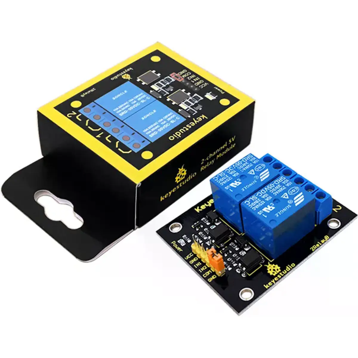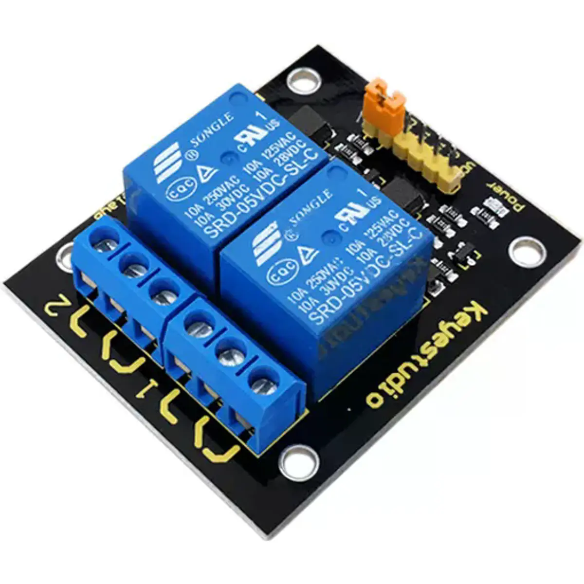 Este módulo de relé utiliza um relé de alta qualidade com dois canais de entrada e dois canais de saída. Pode ser conectado a elementos AC de 250V/10A ou elementos DC de 24V/10A no máximo, portanto, pode ser utilizado para controlar luzes, motores, entre outros.