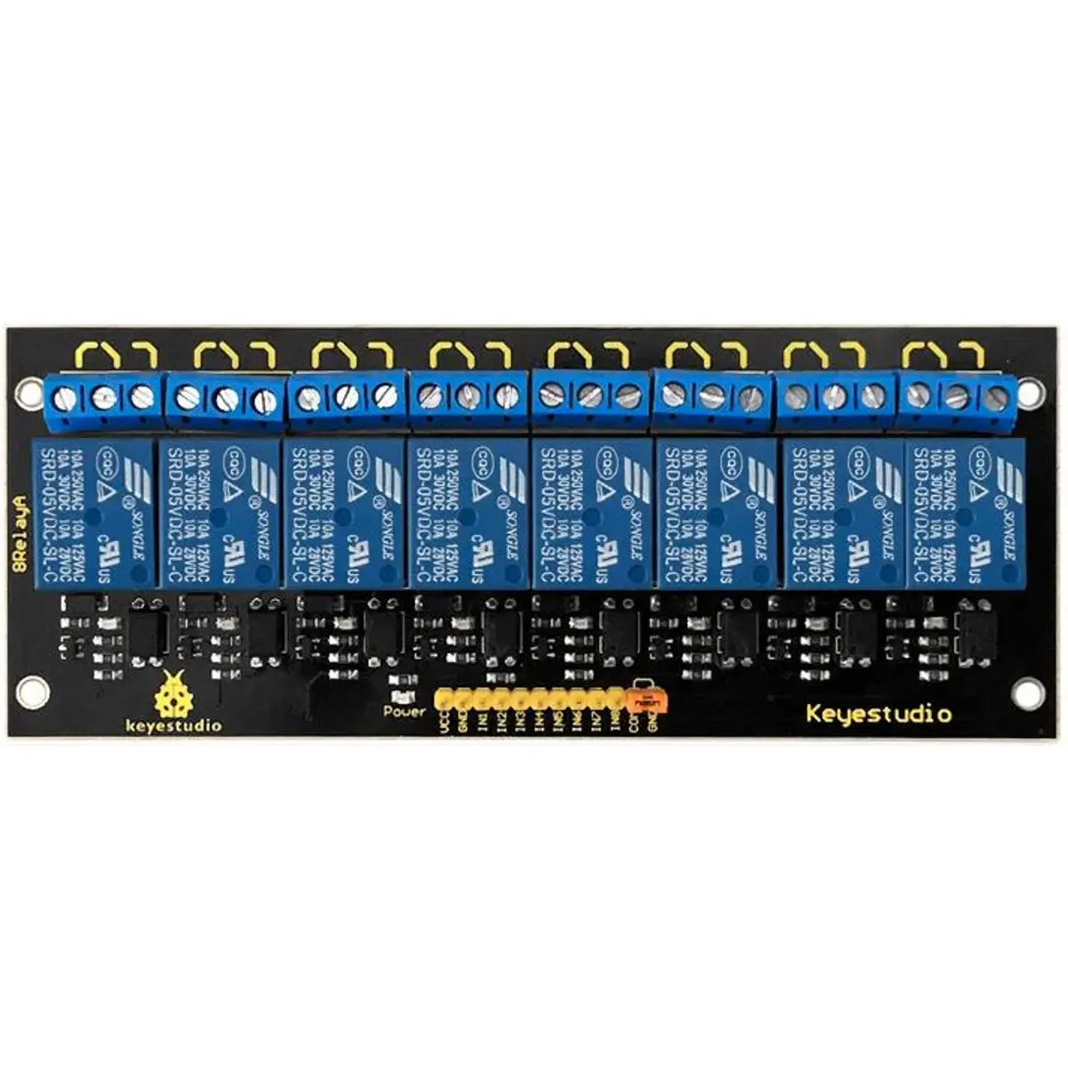 Este módulo utiliza um relé de alta qualidade com oito canais de entrada e oito canais de saída. Pode ser conectado a elementos de 250V/10A AC ou 24V/10A DC no máximo, podendo ser utilizado para controlar luzes, motores, entre outros.