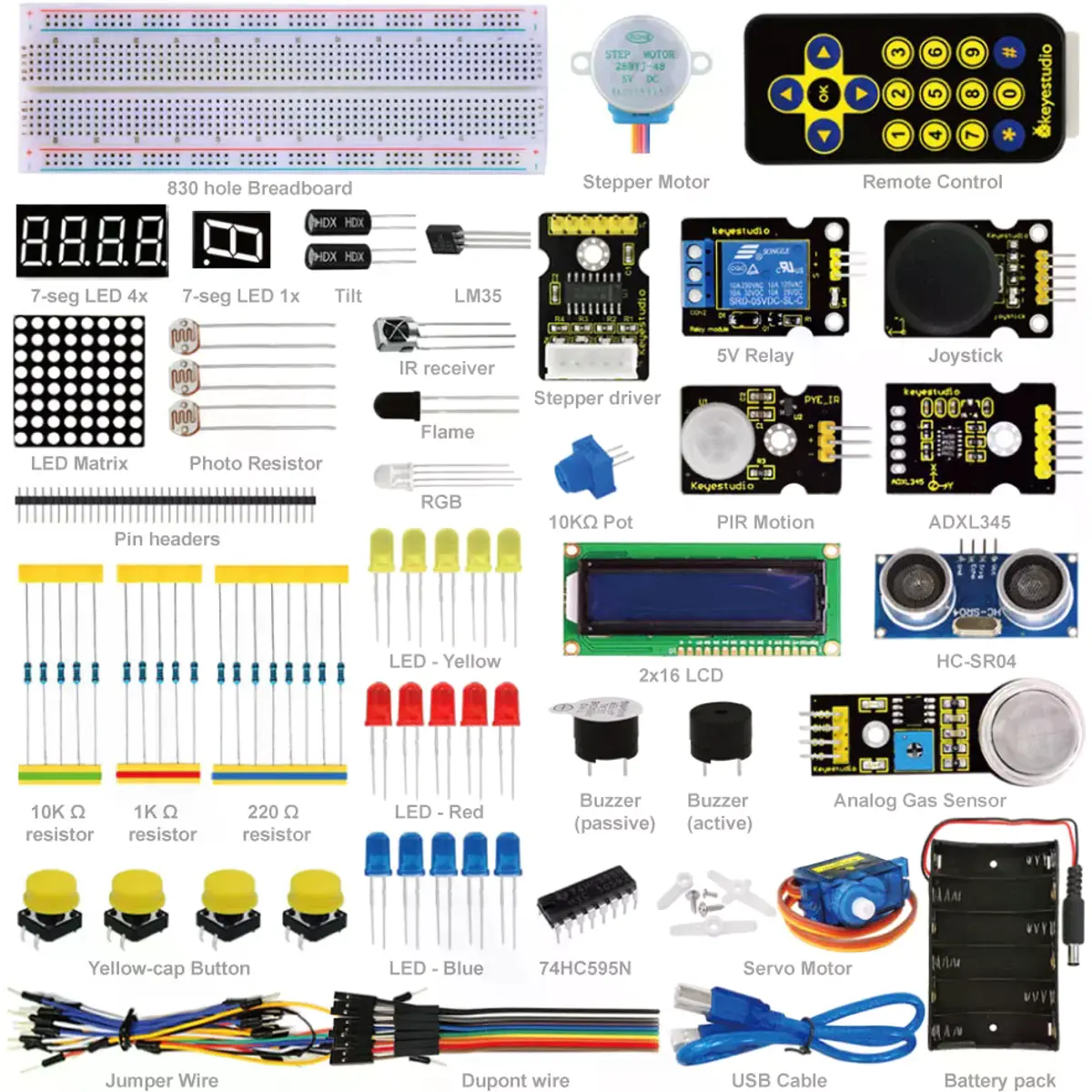 Kit de iniciação eletrónica com componentes comuns para aprender electrónica de forma prática. Inclui LEDs de várias cores, LED RGB, resistências, botões, potenciômetro, buzzer, sensores (inclinação, fotoresistores, chama, temperatura LM35, movimento PIR), sensor ultrassónico HC-SR04, Display LCD 2x16, módulos de LED 7 segmentos, matriz de LED 8x8, Receptor IR, controle remoto IR, servo, motor de passo e módulo de relé. Acompanha breadboard de 830 furos, cabos Dupont, fios jumper, cabo USB, 40 pinos e um manual com 21 projetos, do básico ao avançado.