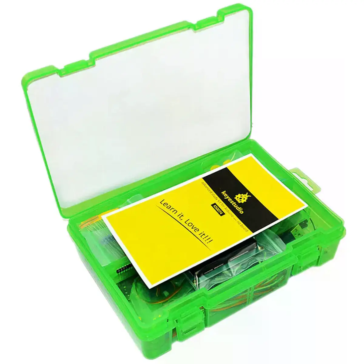 Este Kit avançado para Aduino ajuda-te a saber usar um Arduino de maneira prática. O kit inclui uma seleção dos componentes eletronicos mais comuns, como LEDs, resistências, sensores, etc. e vem acompanhado com um manual de 21 projetos, começando pelo básico da eletrônica até projetos mais complexos.