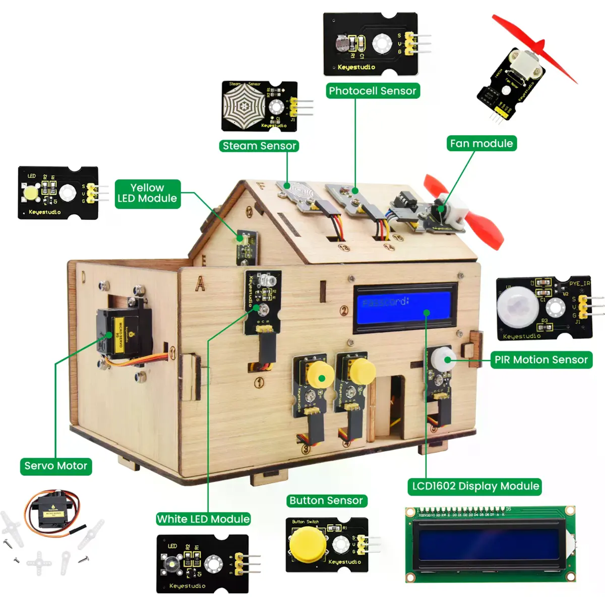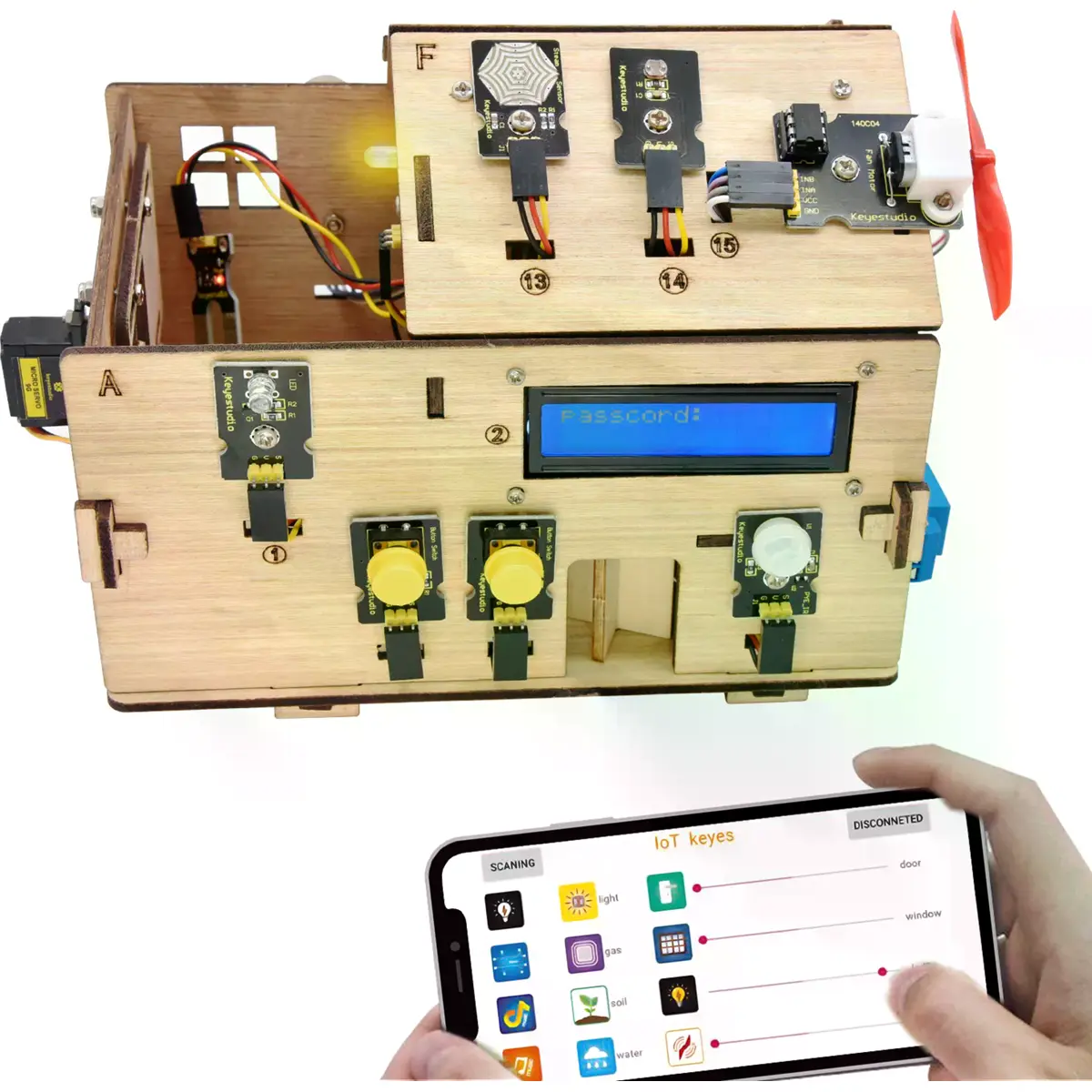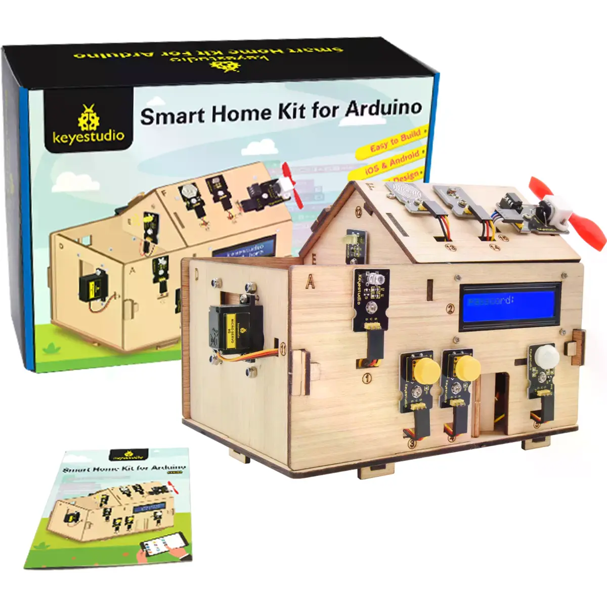 Este Kit de Aprendizagem de Casa Inteligente, baseado na plataforma Arduino, simula uma casa inteligente real, oferecendo uma experiência de vida confortável e acolhedora. Na prática, a programação lógica funciona como uma "mão invisível", controlando diversos dispositivos da casa: liga o ar condicionado, inicia o aquecedor de água, garante a segurança da casa com uma fechadura eletrónica e ajusta as luzes LED e cortinas inteligentes para se ativarem automaticamente quando chegamos em casa.