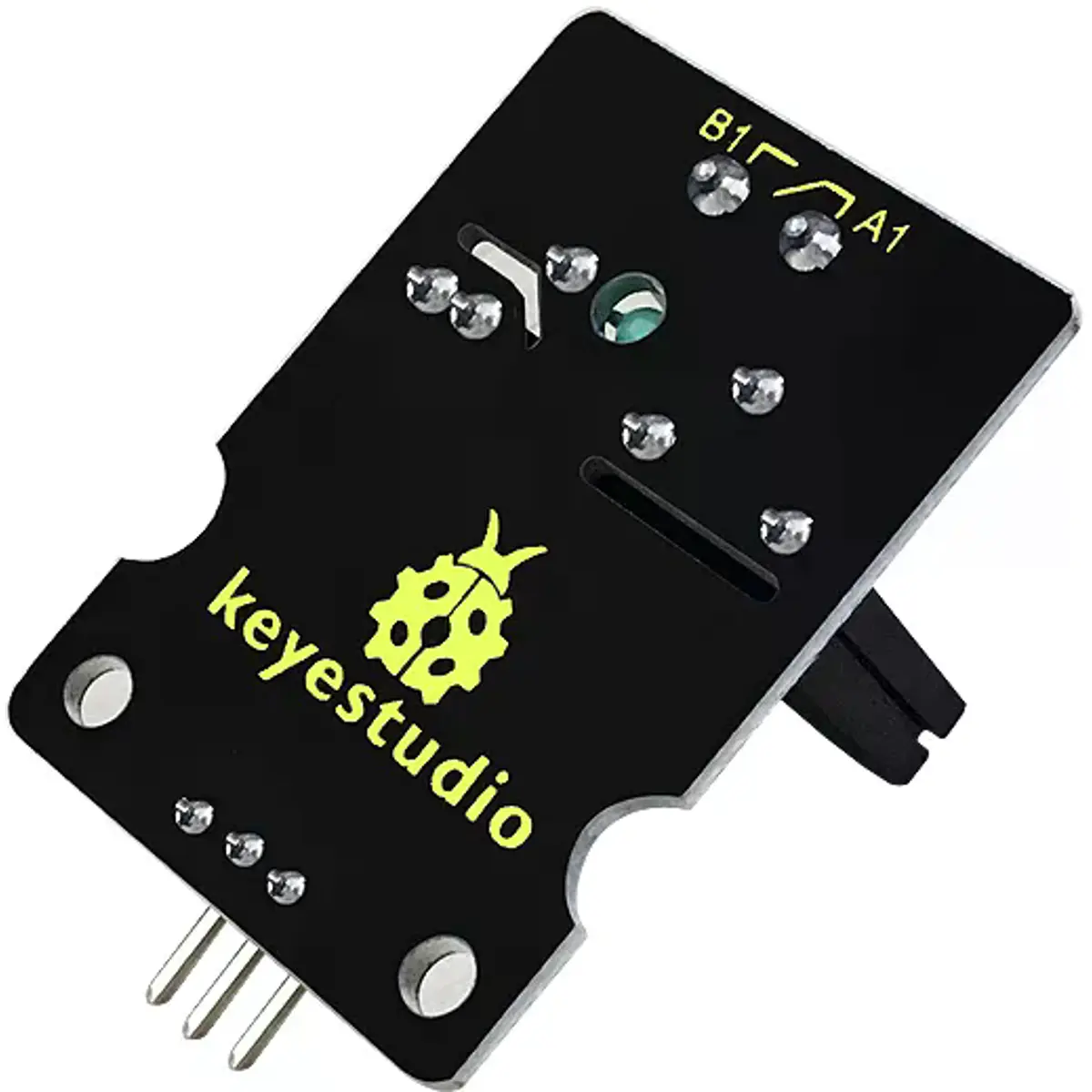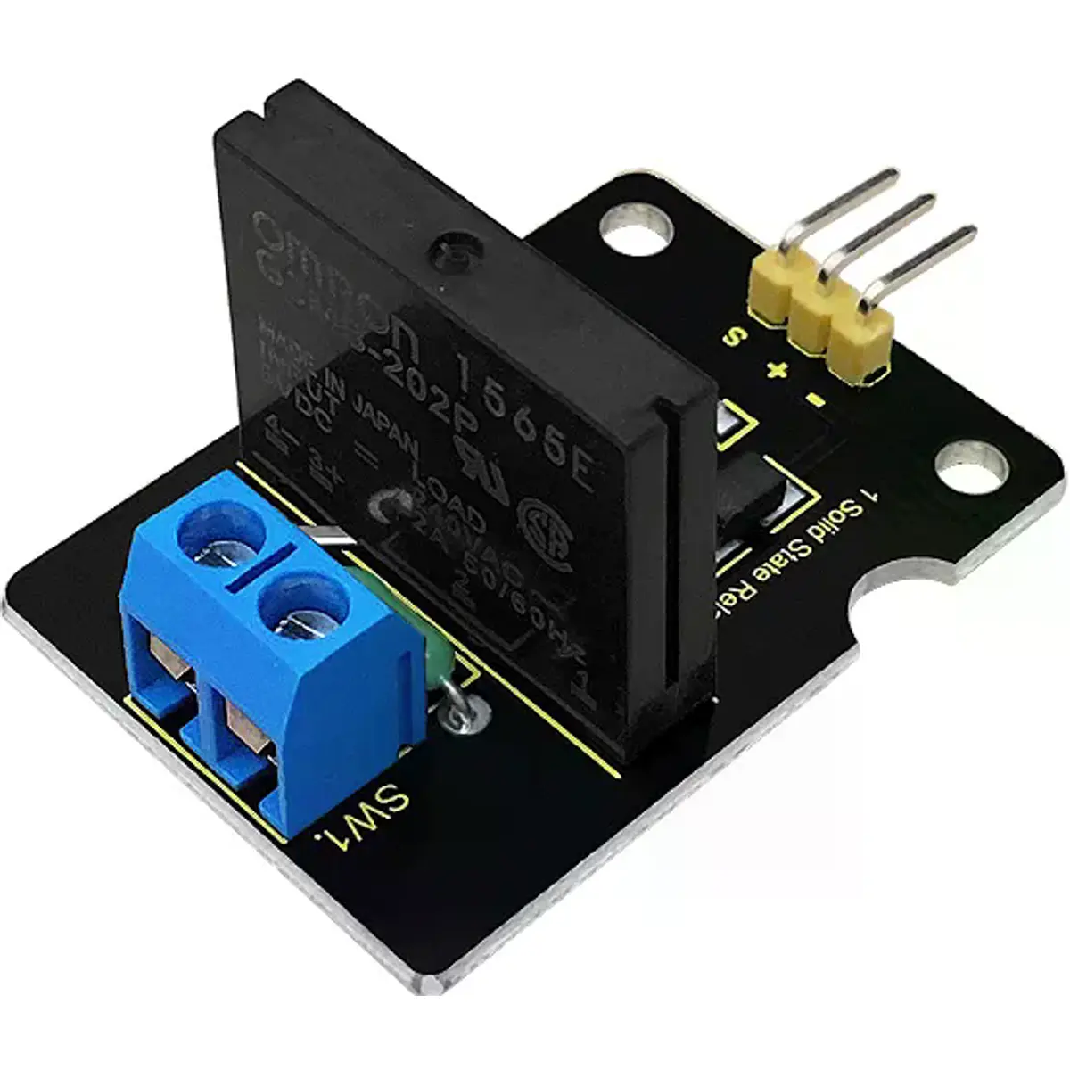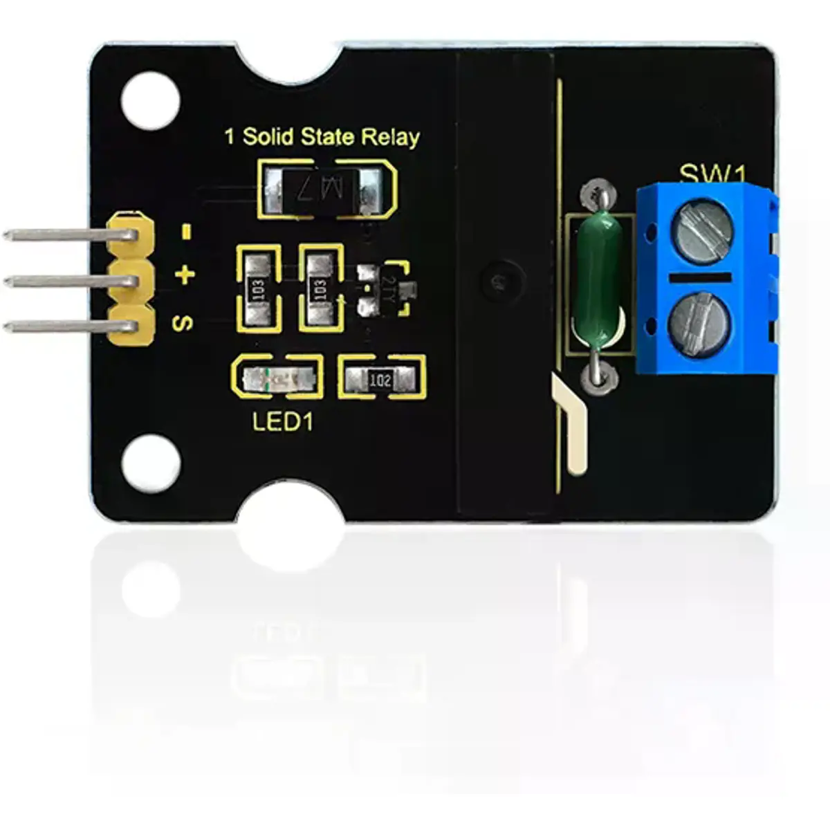 O relé de estado sólido Keyestudio é ativado por nível baixo, ou seja, quando o sinal de controle de entrada está em nível baixo (0-1.5 V), o relé está ligado; enquanto o sinal de controle de entrada está em nível alto (3-5 V), o relé está desligado.
