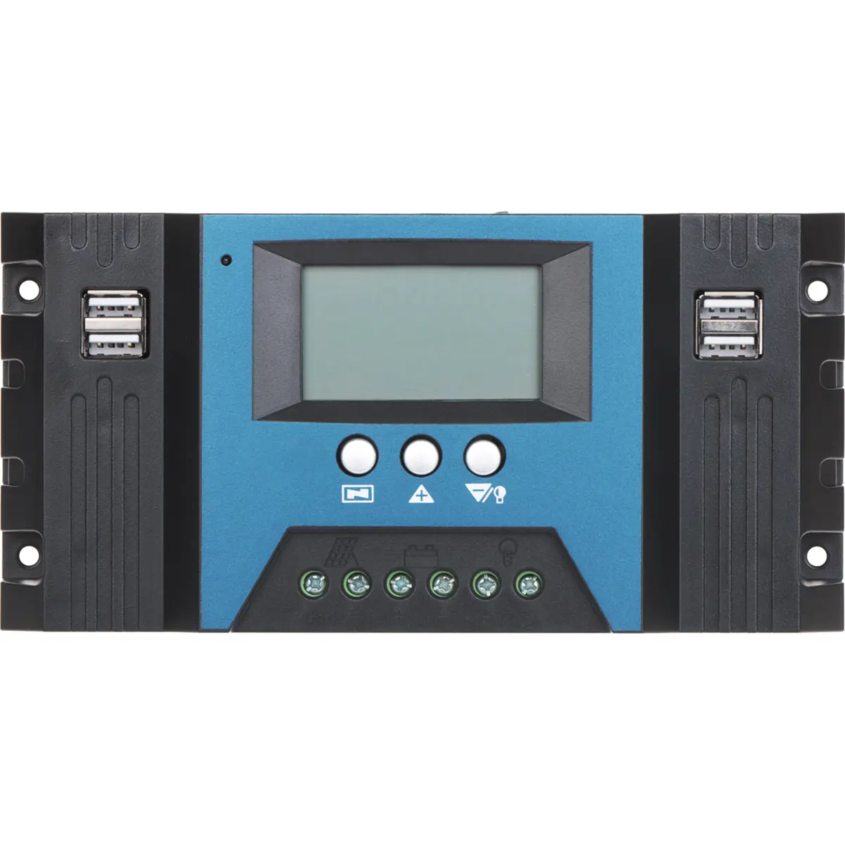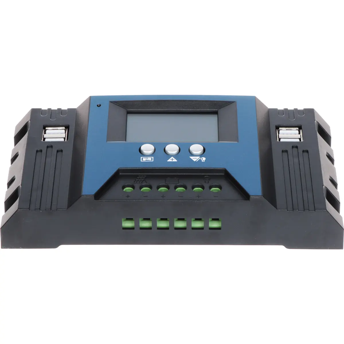 Controlador de carga solar PWM de 3 estágios com ecrã LCD para sistemas 12/24/36/48/60 V. Permite ligar módulos em série ou paralelo, mantendo a corrente e a tensão dentro dos limites. Tensão nominal até 60 V, corrente de carga até 30 A (bateria até 100 A). Saída USB de 5 V, com duas portas para alimentação. Compatível com baterias AGM e de gel. Compacto (169 x 94 x 40 mm) e leve (0,3 kg), ideal para instalações fotovoltaicas residenciais ou móveis.
