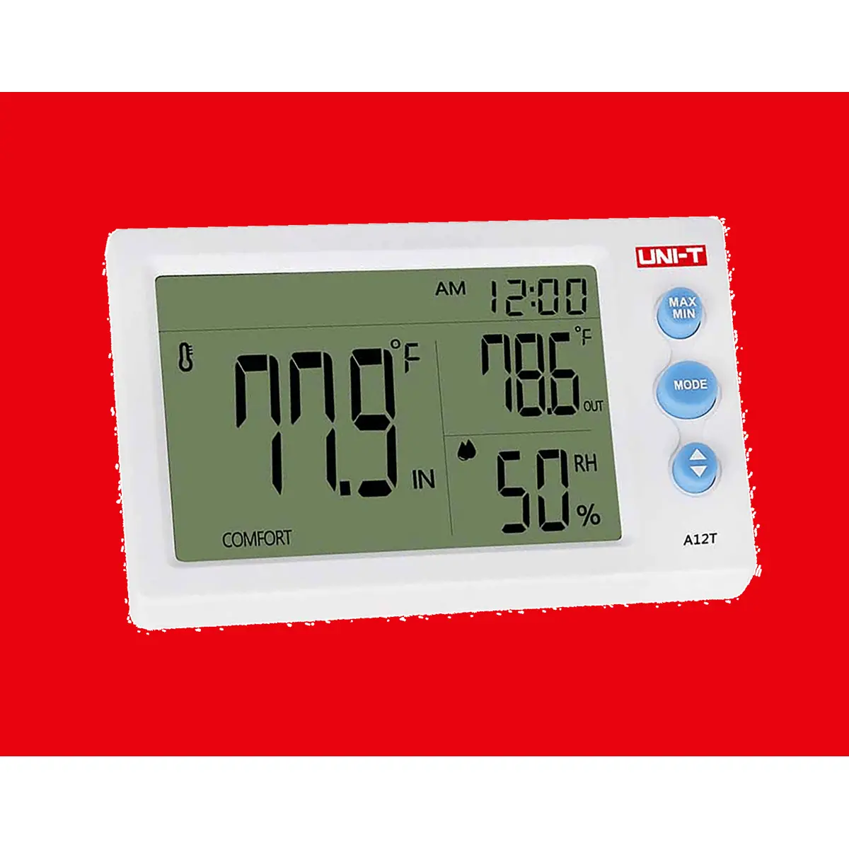 A Uni-T A12T é uma estação meteorológica precisa e fácil de utilizar, ideal para monitorizar temperatura e humidade em ambientes domésticos ou de trabalho. Com um design compacto e funcionalidades úteis, permite um controlo detalhado das condições ambientais.