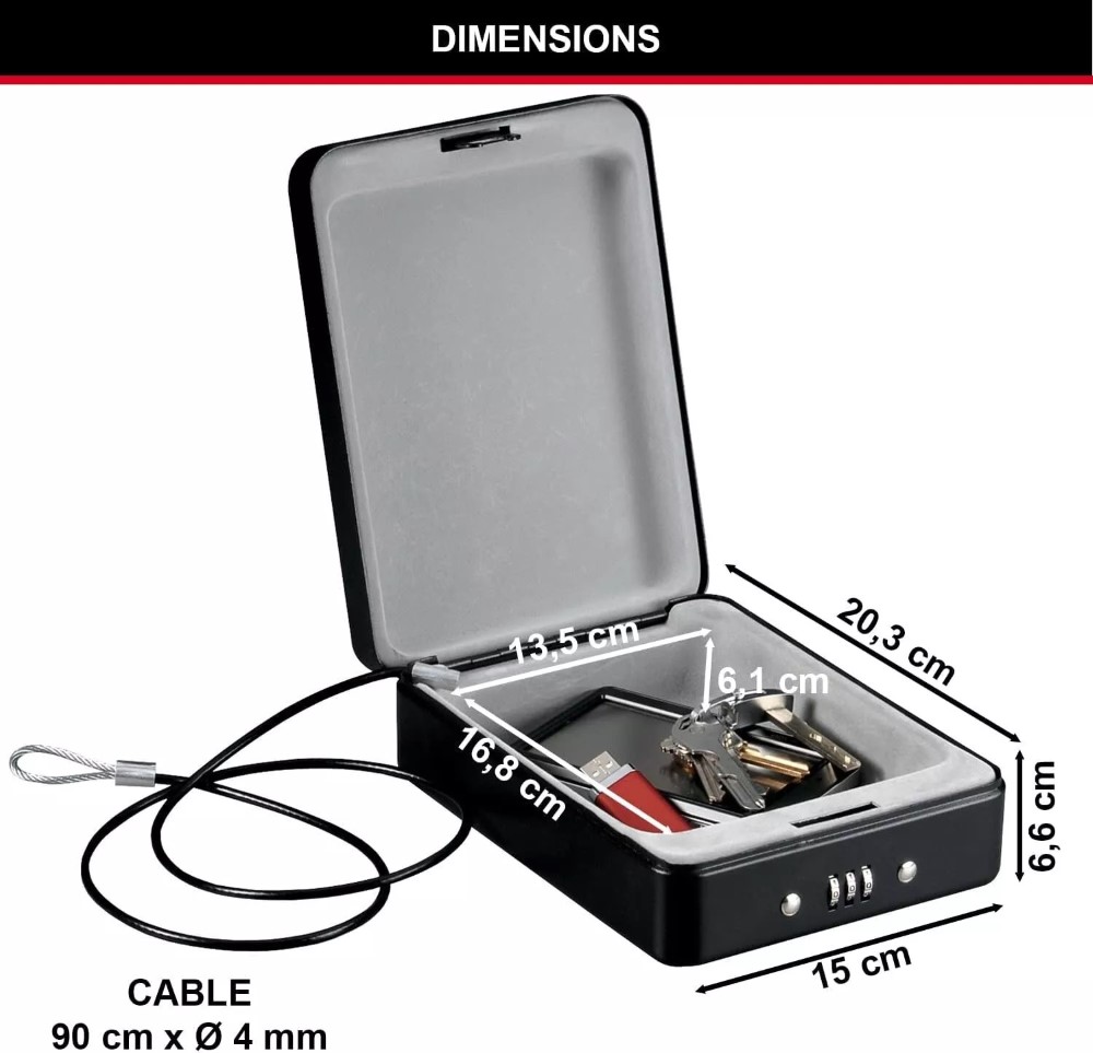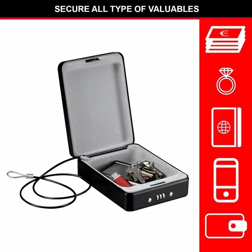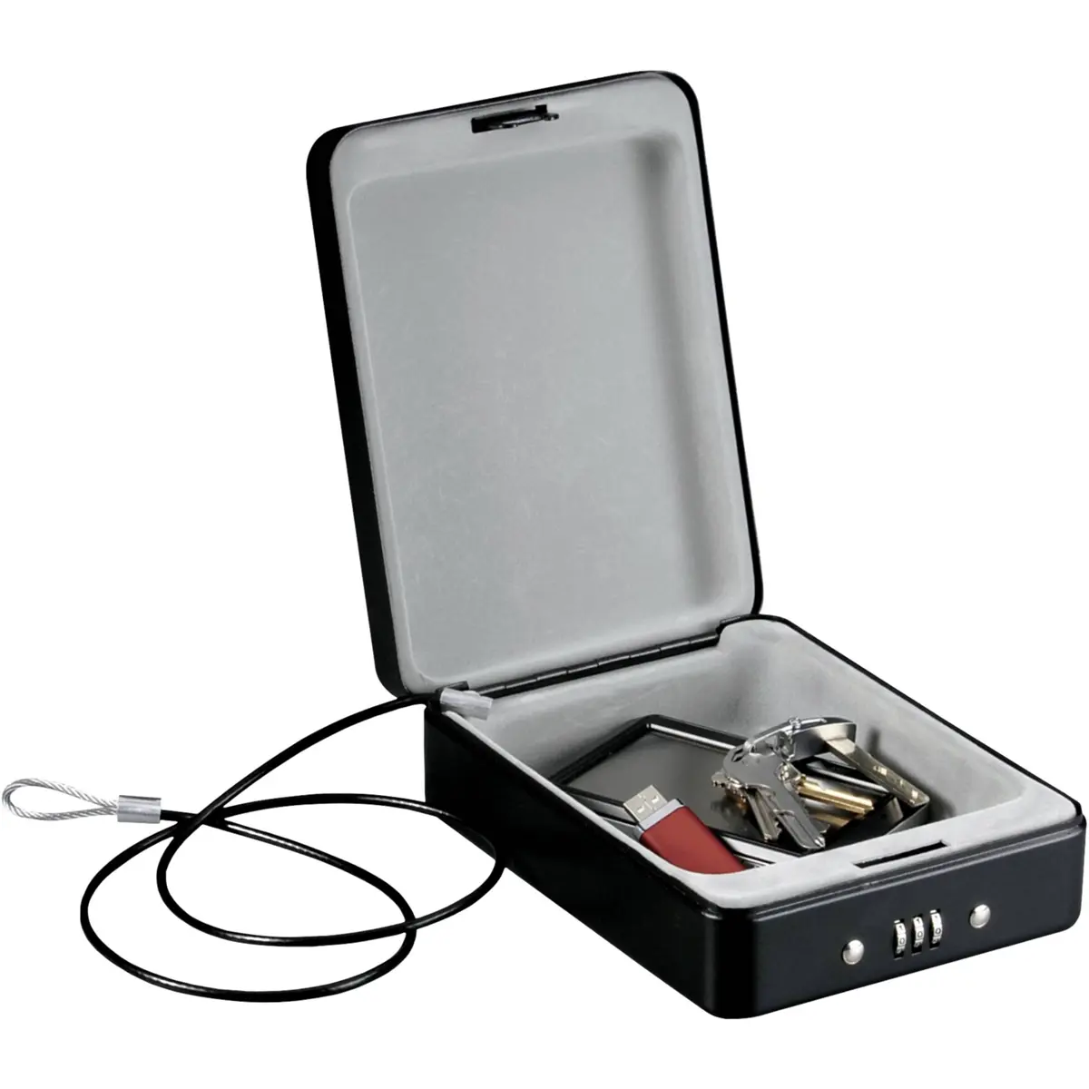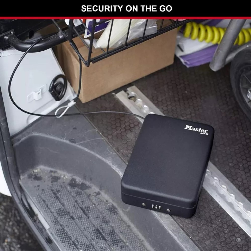 O pequeno cofre portátil Master Lock P005CEURBLKHRO, com fecho de combinação, é a solução ideal para segurança em movimento. Perfeito para carros, carrinhas, universidade, autocaravanas, barcos ou viagens à praia. Foi concebido para proteger telemóveis, carteiras, leitores de MP3 e outros equipamentos compactos, mas valiosos, que são especialmente vulneráveis ao roubo. Leve-o. Tranque-o. Deixe-o.