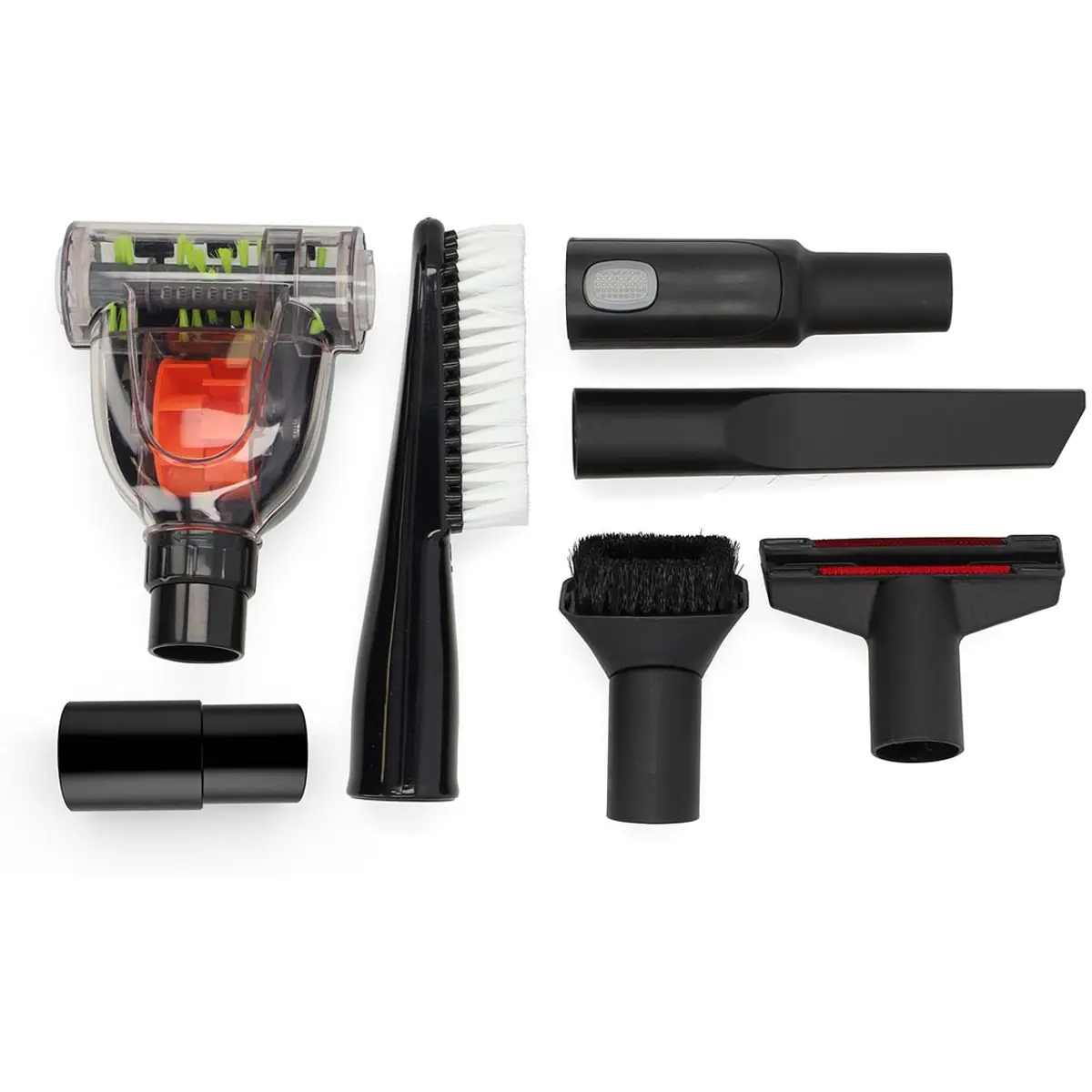 Este conjunto de acessórios universais para aspiração automóvel facilita a limpeza do interior, com bocal fino longo para espaços estreitos, escovas para estofos, painel de controlo e tapetes, e uma escova universal para várias superfícies. Inclui adaptador oval para diâmetros de 32 a 35 mm, oferecendo compatibilidade alargada. Ideal para remover pó, sujidade e pelos de animais, proporcionando limpeza eficaz e cuidadosa do interior do veículo.