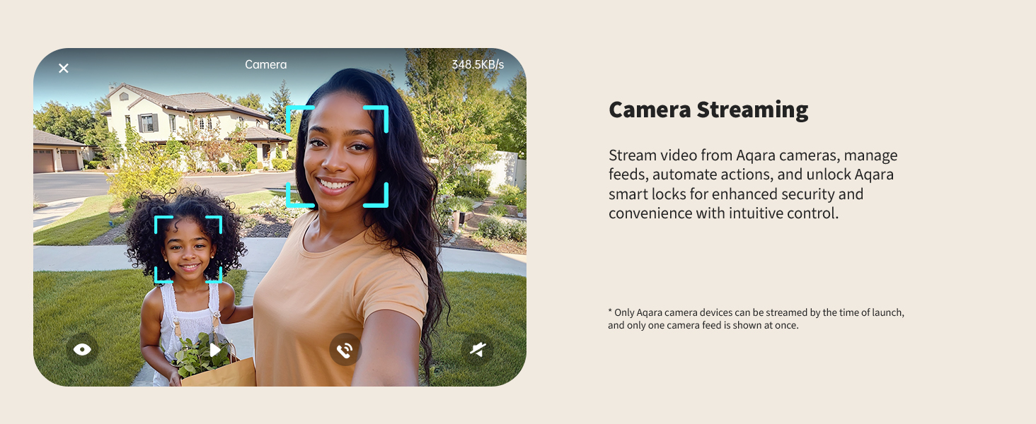 - Transmissão de vídeo: O painel permite visualizar a transmissão de vídeo da campainha inteligente Aqara G4. Quando um visitante chega, pode ver a pessoa diretamente e se comunicar com ela através da tela. Também é possível destrancar a fechadura inteligente Aqara diretamente no painel. Além disso, pode gerenciar várias câmeras Aqara através do painel, melhorando a coordenação entre os dispositivos e a eficiência na gestão da casa inteligente.