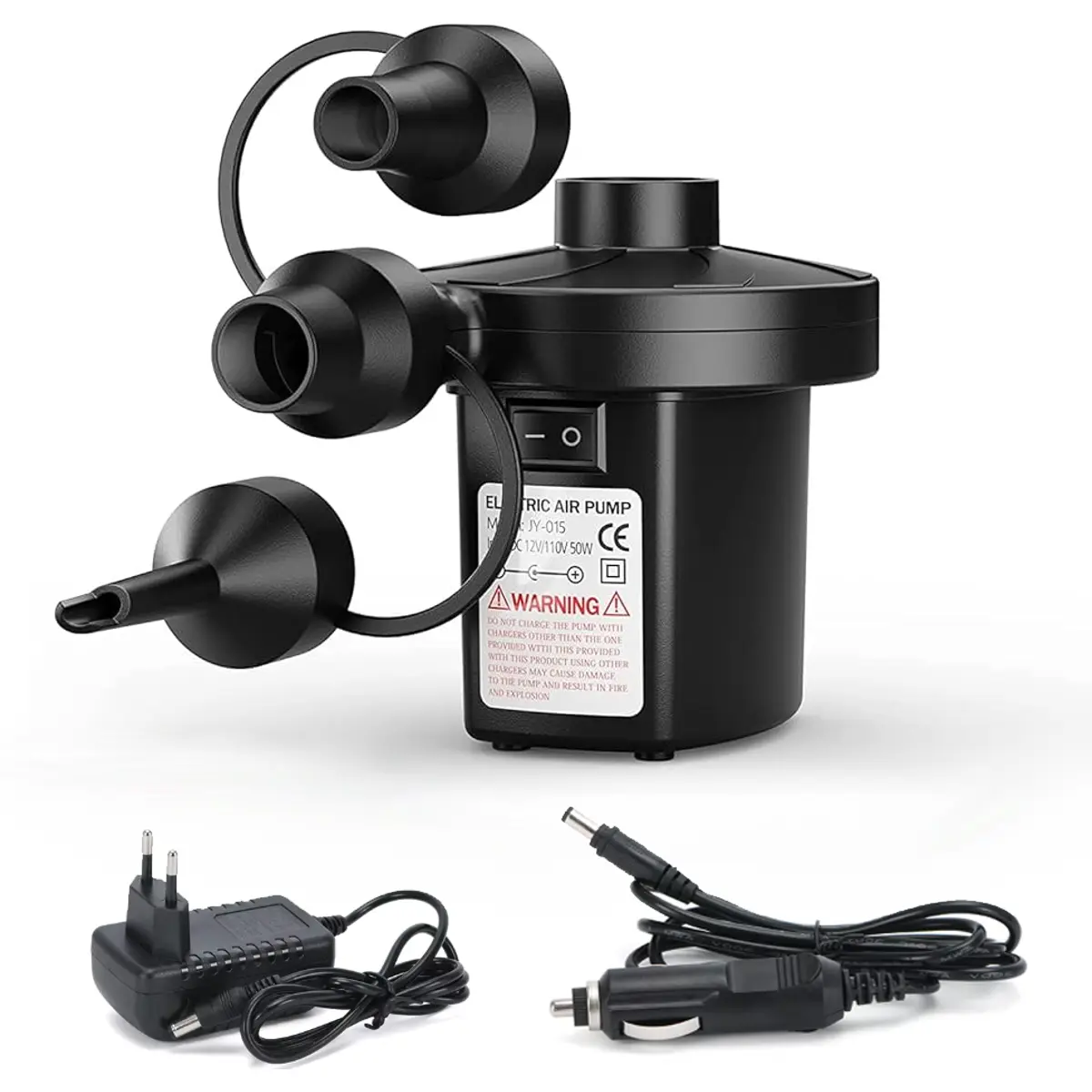 Inclui três bicos de diferentes tamanhos, tornando-a compatível com uma grande variedade de insufláveis, como colchões, bolas, botes, piscinas e brinquedos insufláveis.