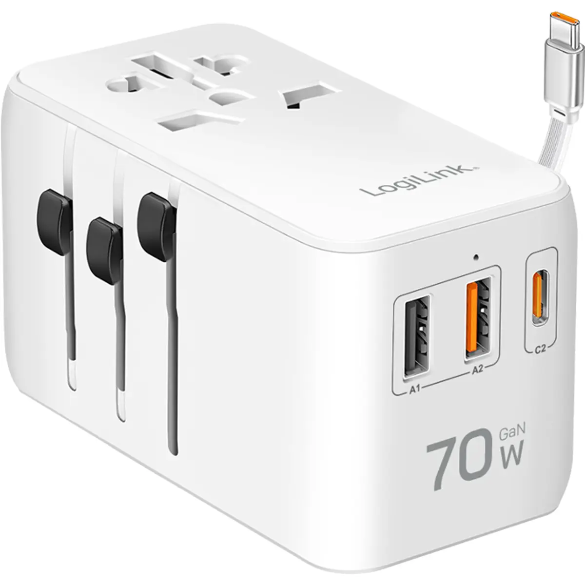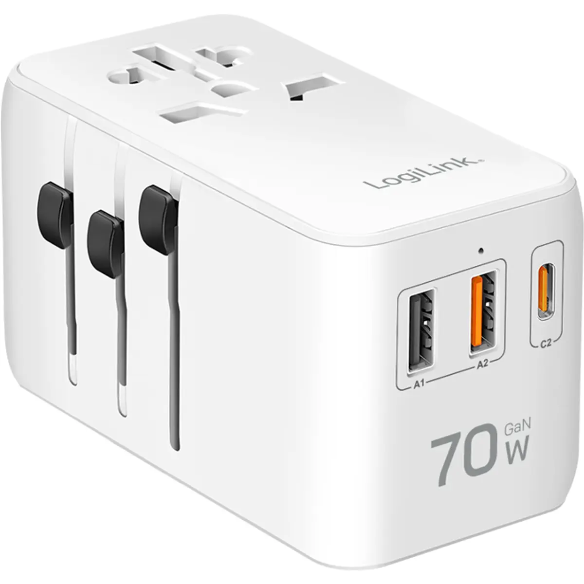 Este adaptador de viagem universal com potência total de 70W e tecnologia GaN é a solução ideal para carregamento eficiente em mais de 200 países. Equipado com múltiplas portas USB-C e USB-A, além de uma tomada AC, permite alimentar simultaneamente diversos dispositivos como portáteis, smartphones, tablets, auscultadores, powerbanks, lâmpadas LED, pequenos aquecedores ou mantas elétricas. O seu corpo ignífugo e proteções eletrónicas garantem segurança máxima em qualquer situação.