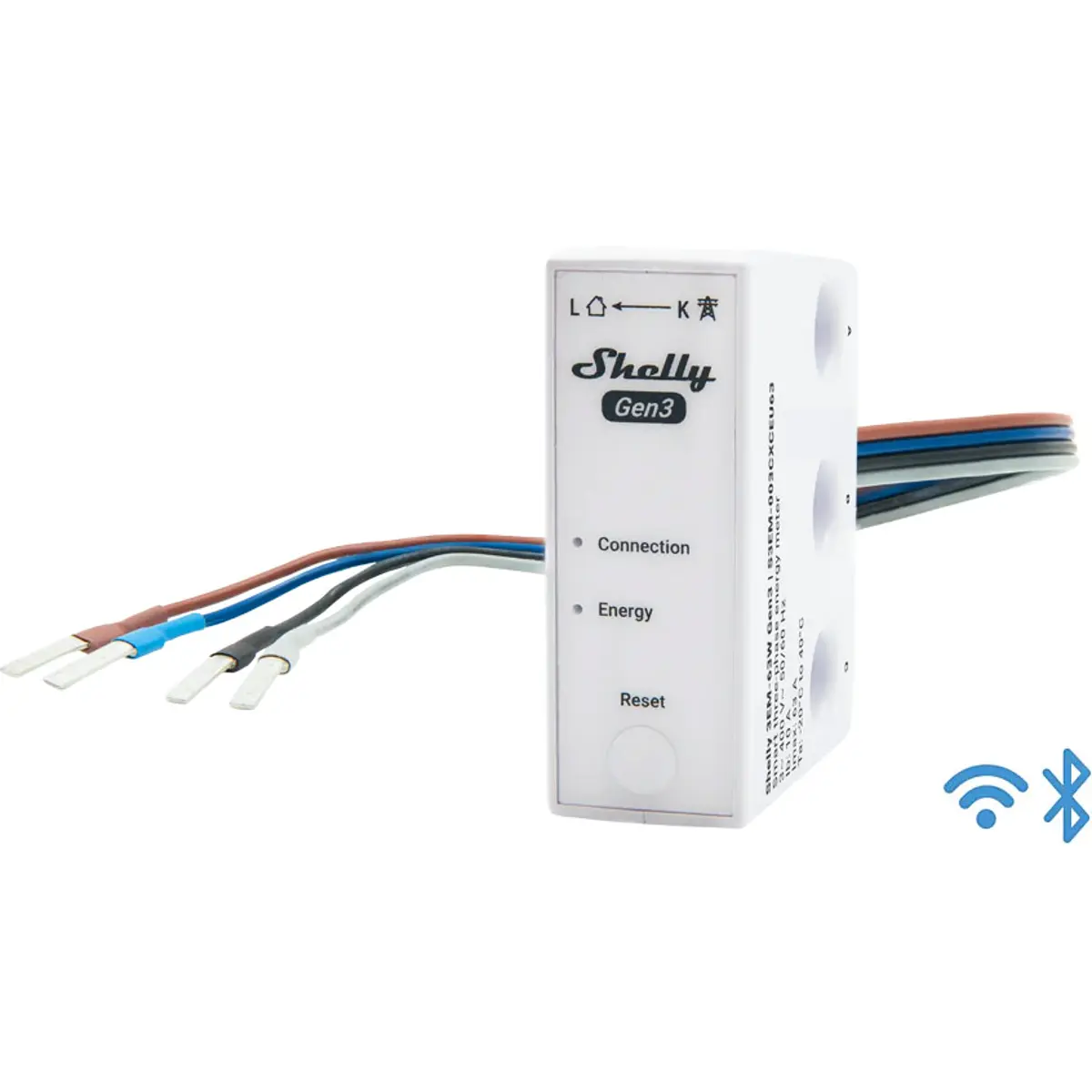 O seu formato reduzido permite a instalação direta sobre ou sob disjuntores em calha DIN, poupando espaço no quadro elétrico. Esta versão (3EM-63W Gen3) inclui fios, codificados por cores, para facilitar a ligação rápida e correta.