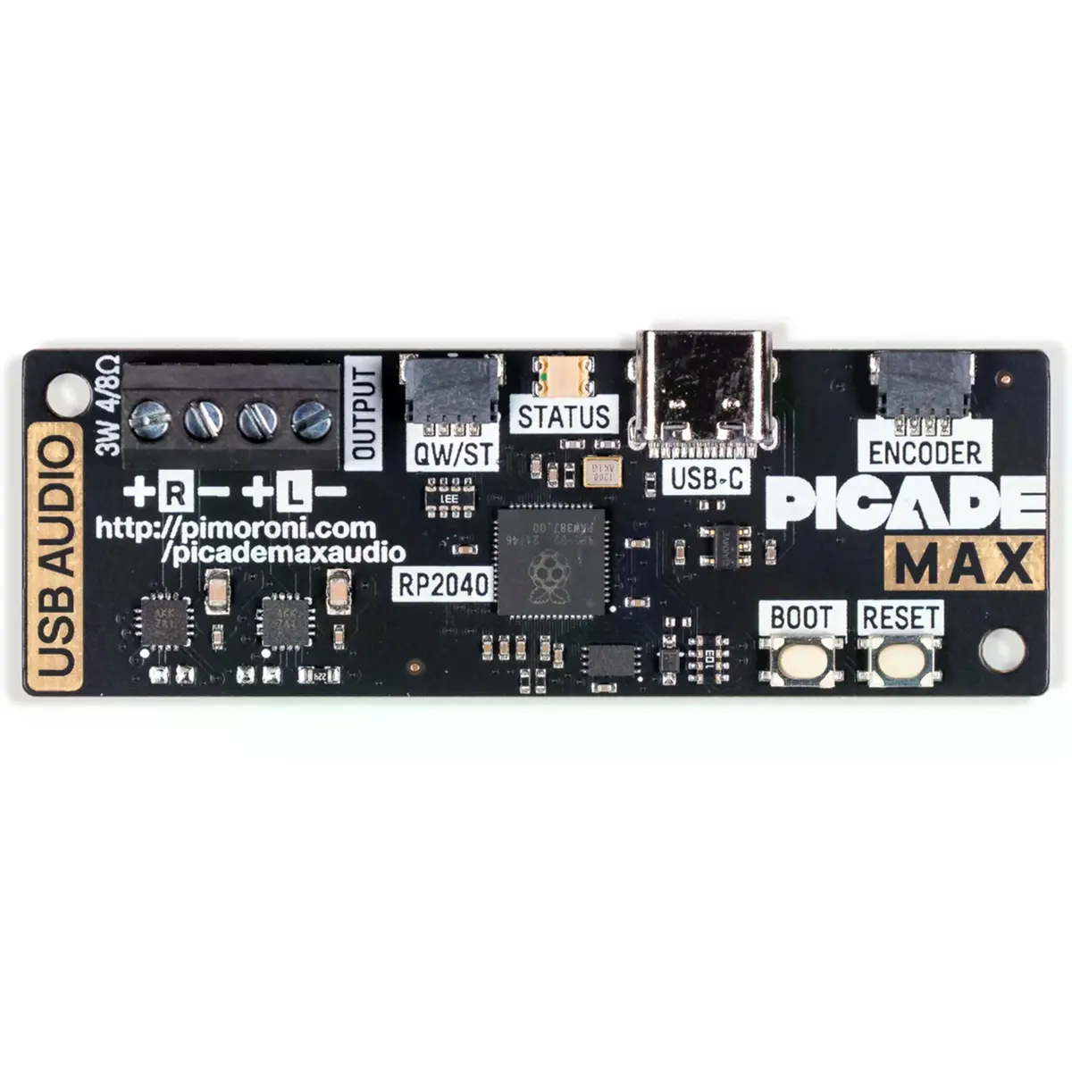 Placa RP2040 permite ligar facilmente um par de colunas pequenas a um Raspberry Pi (ou outro computador) através de uma saída USB-C. Inicialmente desenvolvida para o Picade Max, esta placa é útil para outras construções onde queira ligar colunas via USB-C, especialmente agora que as entradas de áudio 3.5mm estão a tornar-se raras.