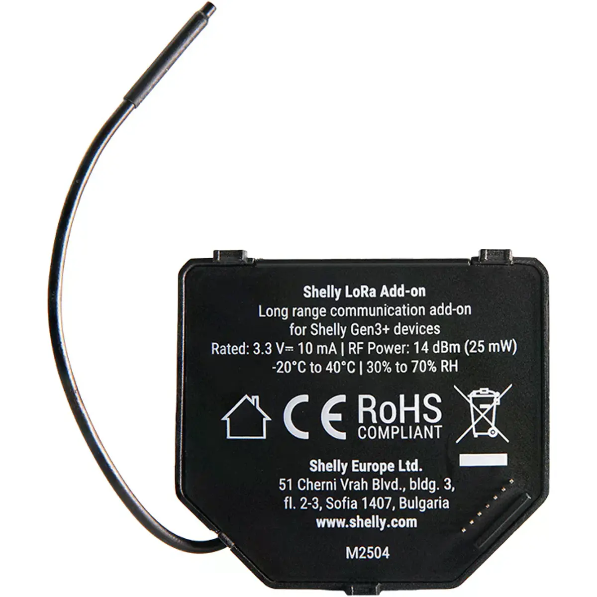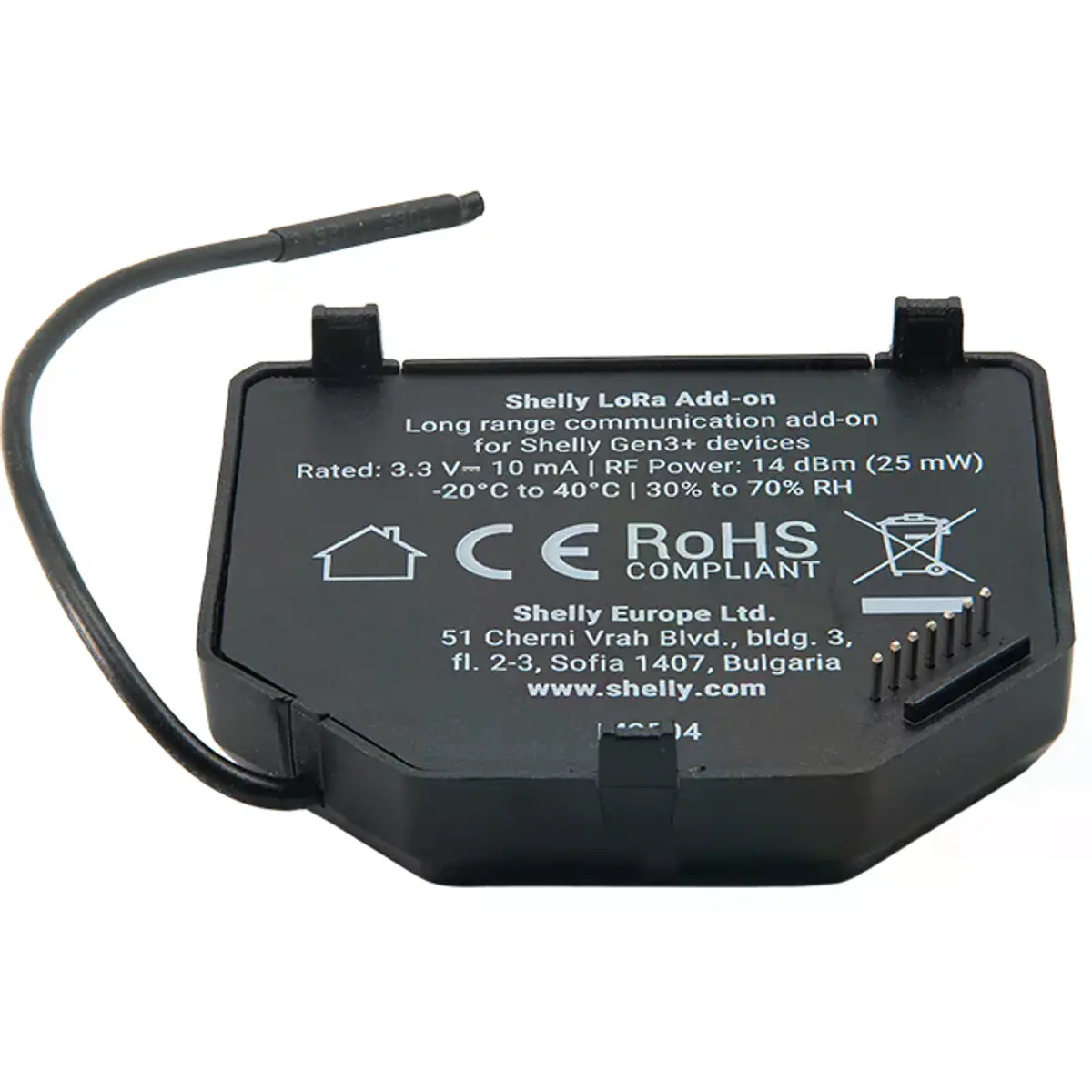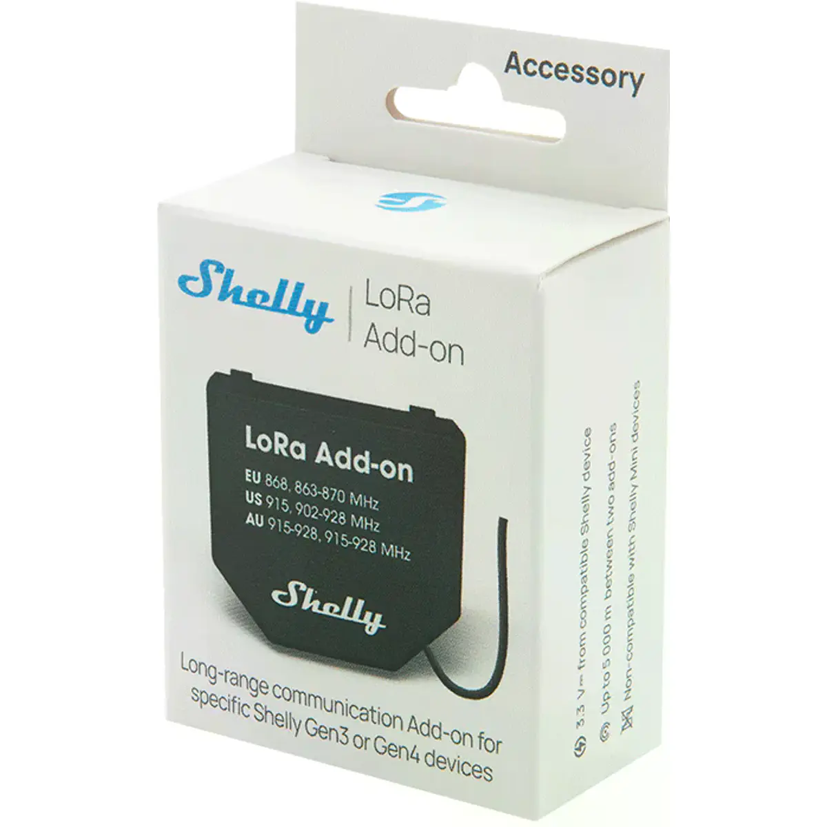 O Shelly LoRa Add-On é um módulo compacto que acrescenta comunicação sem fios de longo alcance (até 5 km) aos dispositivos Shelly Gen3 e Gen4. Utiliza a tecnologia LoRa e um protocolo proprietário Shelly para permitir controlo fiável em ambientes onde outras tecnologias — como Wi-Fi, Zigbee ou Bluetooth — não funcionam de forma eficaz.