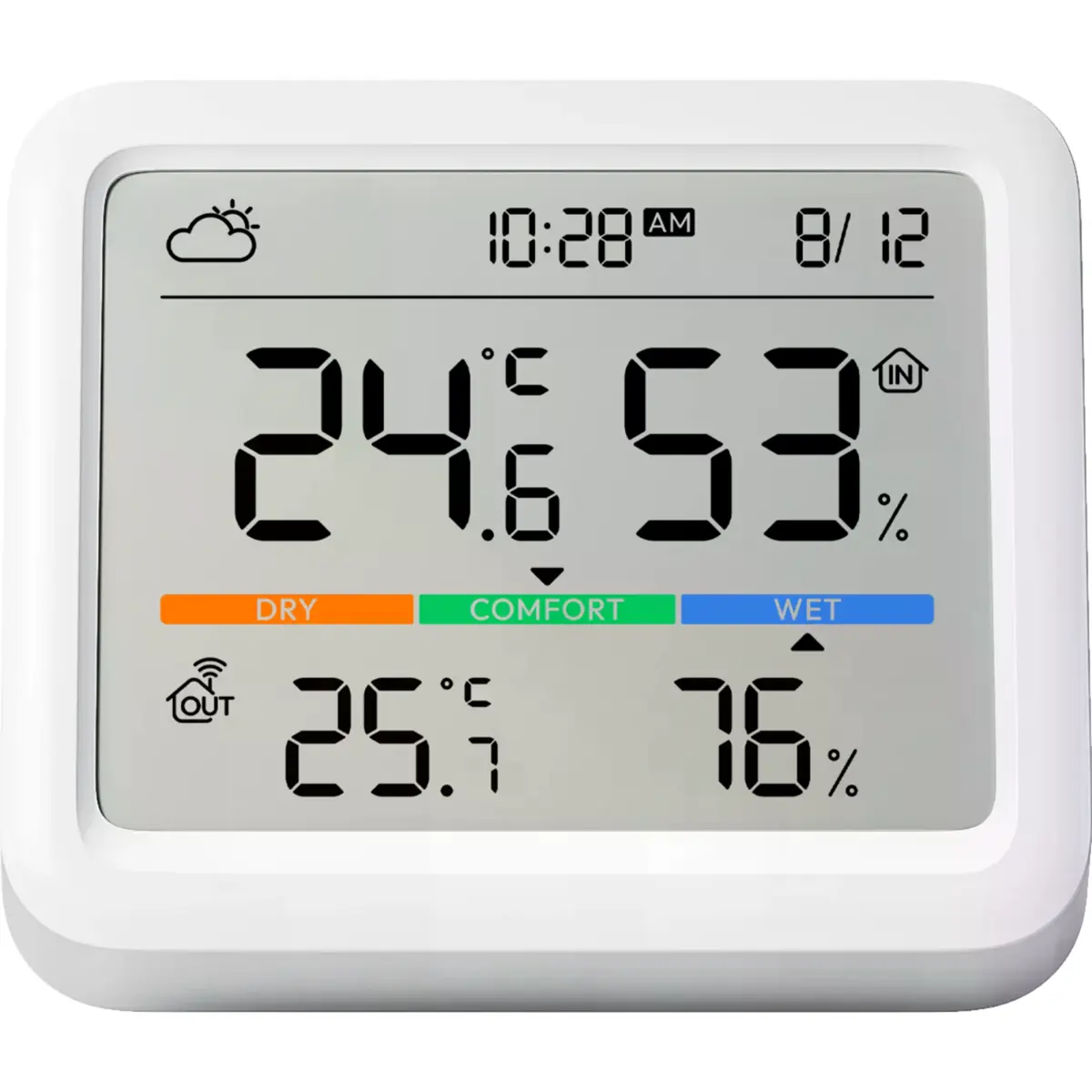 O SwitchBot Meter Pro destaca-se pelo seu ecrã LCD de grandes dimensões (3.6"), que permite visualizar à distância a temperatura, humidade, data, hora e nível de conforto. Um ícone indica se a leitura é interior (IN) ou exterior (OUT), quando ligado a um sensor remoto.