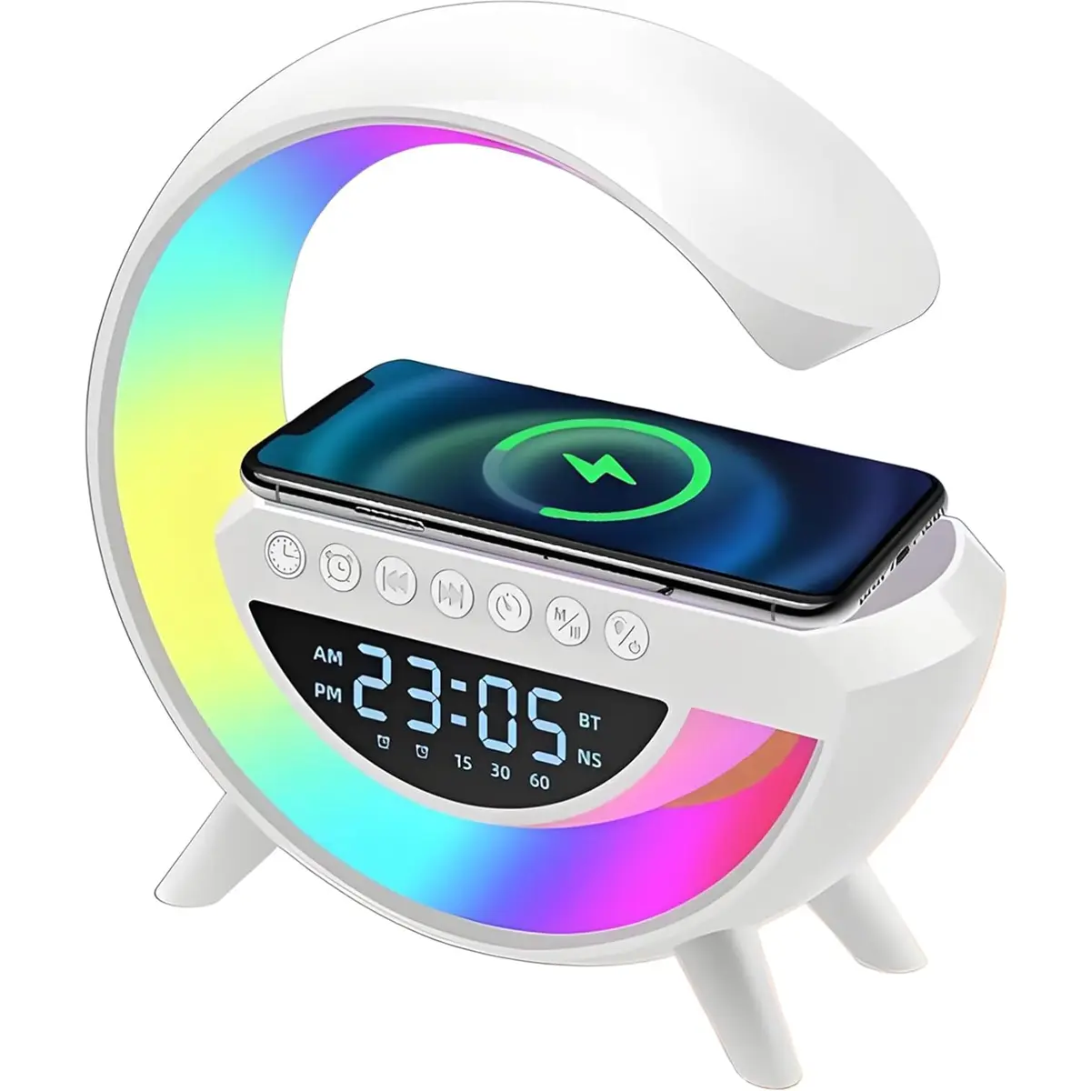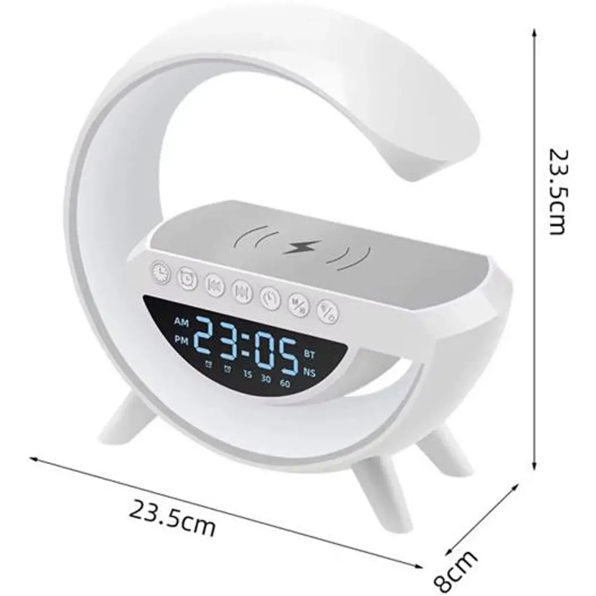 Descubra uma nova dimensão de conforto com este candeeiro multifuncional! Ideal para o quarto, escritório ou sala de estar, combina as funções de lâmpada LED, carregador sem fios, coluna Bluetooth, rádio FM e despertador.