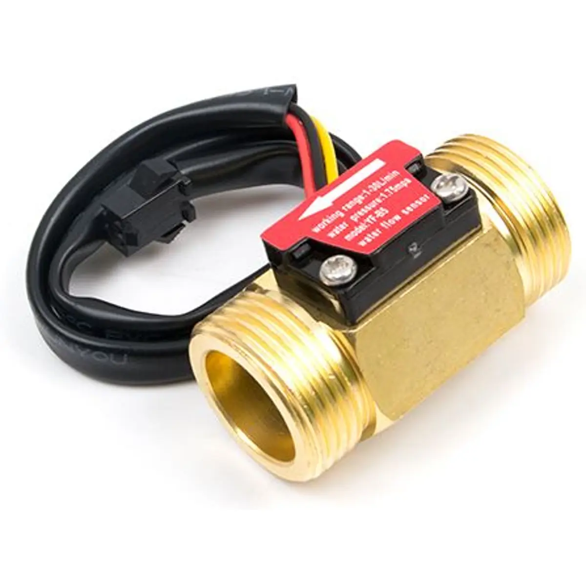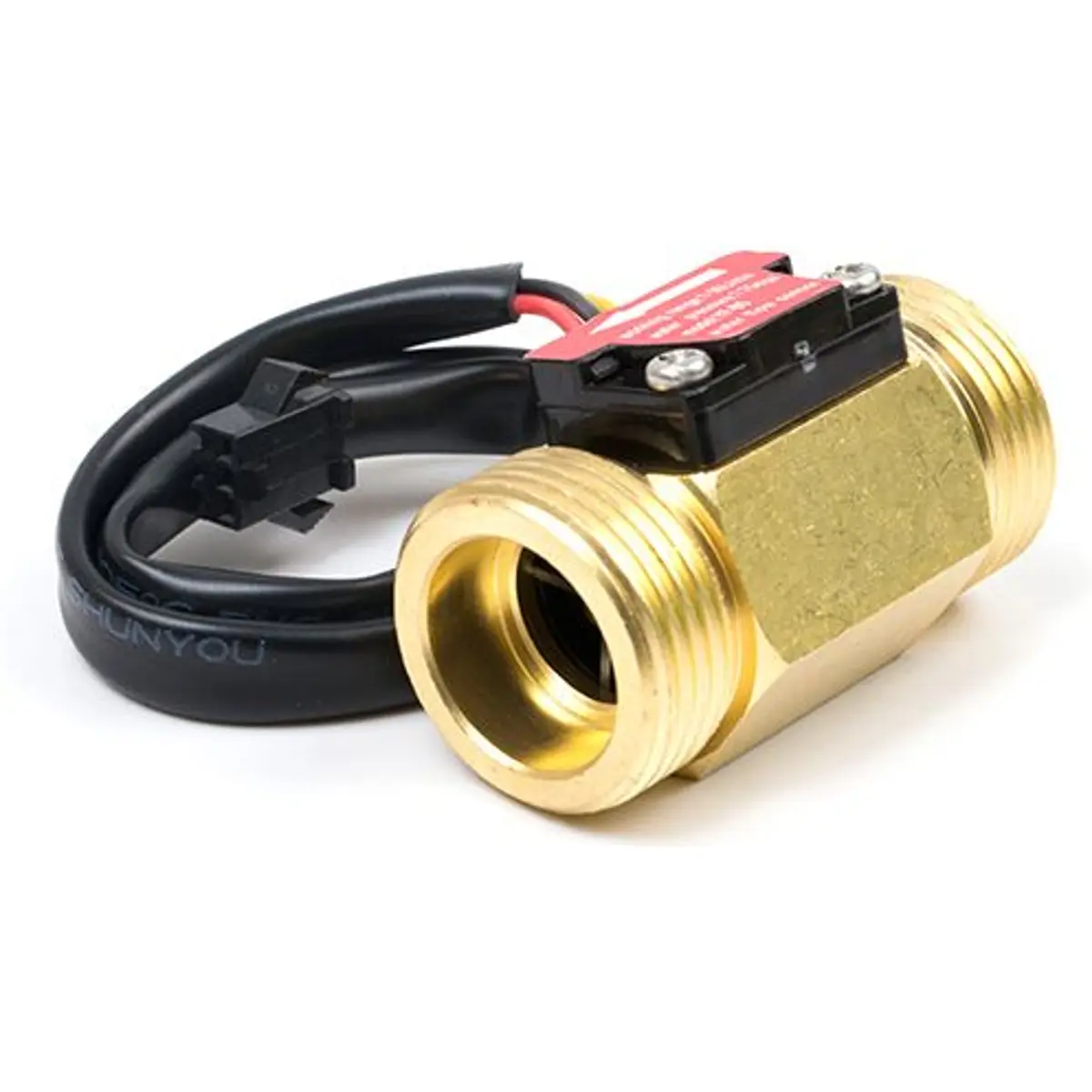 Este sensor de fluxo de água é composto por um corpo em cobre, um rotor e um sensor de efeito Hall. Quando a água flui através do rotor, este começa a girar, e a sua velocidade varia conforme a taxa de fluxo. O sensor de efeito Hall gera um sinal de pulsos correspondente a essa variação. Este sensor é ideal para detetar fluxo em dispensadores de água ou máquinas de café. Comparado com o corpo de plástico, a vida útil do modelo em cobre é mais longa.