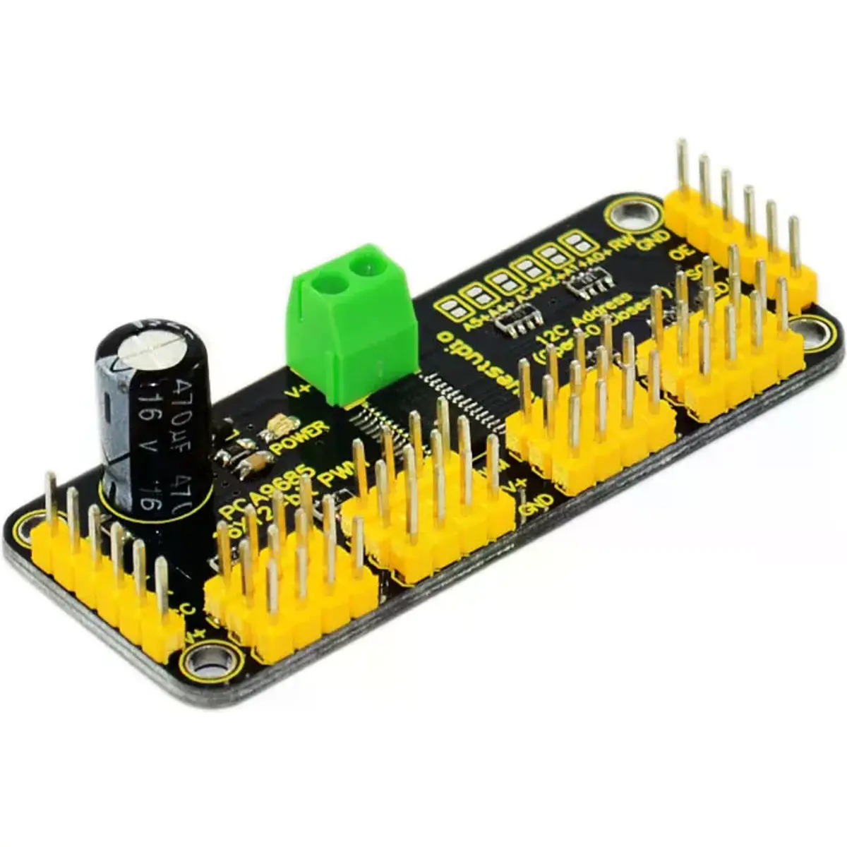 - 6 pinos de seleção de endereço para conectar até 62 módulos em um único barramento I2C, totalizando 992 saídas – muitos servos ou LEDs